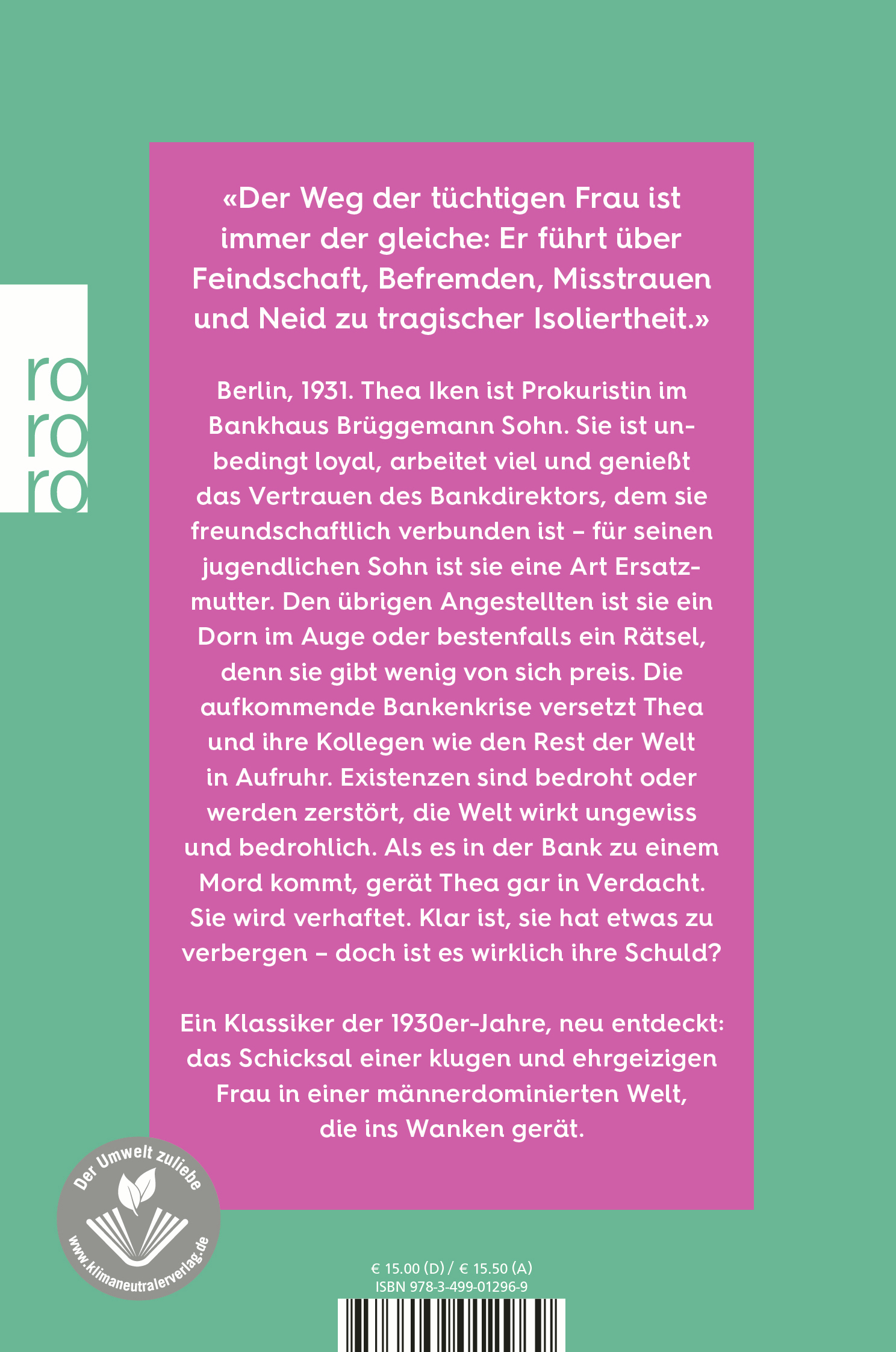 Berlin, 1931. Thea Iken ist Prokuristin im Bankhaus Brüggemann Sohn. Sie ist unbedingt loyal, arbeitet viel und genießt das Vertrauen des Bankdirektors, dem sie freundschaftlich verbunden ist - für seinen jugendlichen Sohn ist sie eine Art Ersatzmutter. Den übrigen Angestellten ist sie ein Dorn im Auge oder bestenfalls ein Rätsel, denn sie gibt wenig von sich preis. Die aufkommende Bankenkrise versetzt Thea und ihre Kollegen wie den Rest der Welt in Aufruhr. Existenzen sind bedroht oder werden zerstört, die Welt wirkt ungewiss und bedrohlich. Als es in der Bank zu einem Mord kommt, gerät Thea gar in Verdacht. Sie wird verhaftet. Klar ist, sie hat etwas zu verbergen - doch ist es wirklich ihre Schuld?