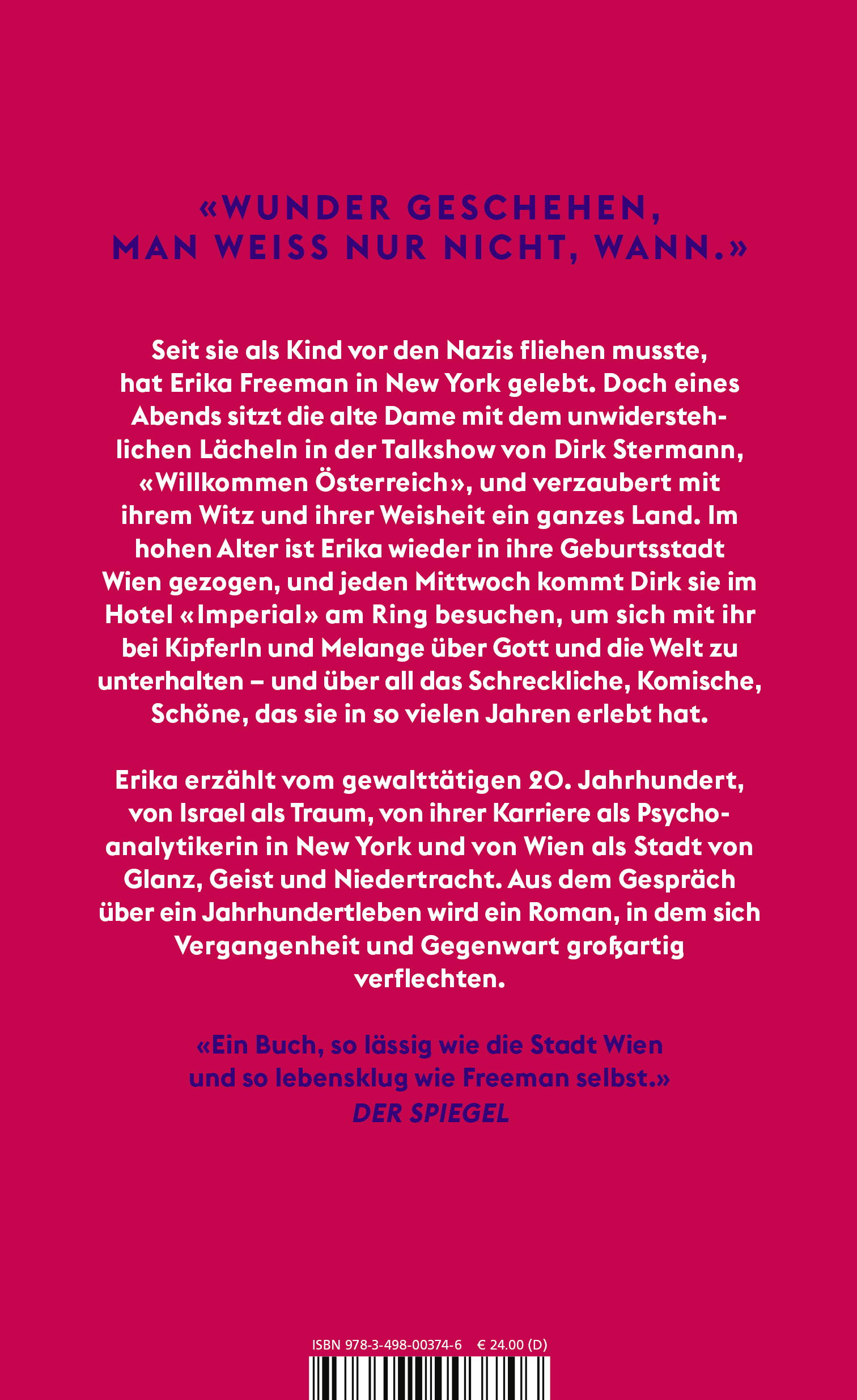Fast ihr ganzes Leben hat Erika Freeman in New York verbracht, dann sitzt sie eines Abends in der Talkshow von Dirk Stermann, «Willkommen, Österreich», und verzaubert ihren Gastgeber und die Nation. Im hohen Alter lebt sie wieder in ihrer Heimatstadt Wien, jeden Mittwoch kommt Dirk sie nun besuchen, um sich mit ihr bei Kipferln und Melange über Gott und die Welt zu plaudern, und aus diesem erzählten Jahrhundertleben einen so amüsanten wie bewegenden Roman zu machen
