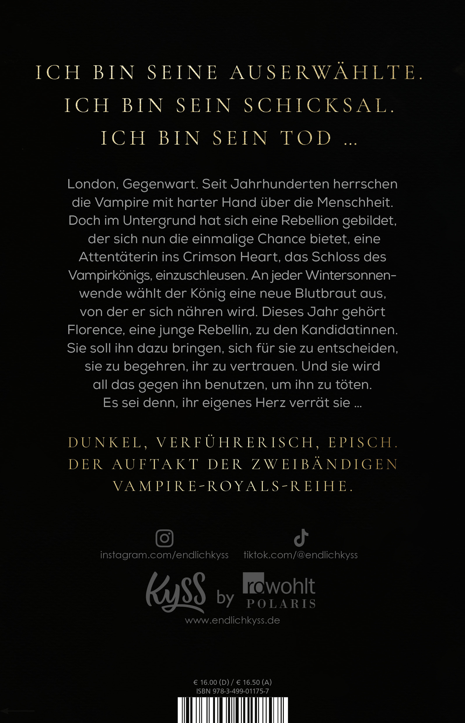 London, Gegenwart. Seit Jahrhunderten herrschen die Vampire mit harter Hand über die Menschheit. Doch im Untergrund hat sich eine Rebellion gebildet. Eine Gruppe von Menschen, die nicht länger bereit ist, diese Unterdrückung hinzunehmen. Auch Florence ist Teil des Widerstands und wurde von Geburt an auf ihre bevorstehende Aufgabe vorbereitet. Mit ihr hat die Rebellion erstmals die Chance, eine Attentäterin ins Crimson Heart, das Schloss des Vampirkönigs, einzuschleusen. An jeder Wintersonnenwende wählt der König eine neue Blutbraut aus, von der er sich nähren wird. Und dieses Jahr gehört Florence zu den Kandidatinnen. Sie soll ihn dazu bringen, sich für sie zu entscheiden, sie zu begehren, ihr zu vertrauen. Und sie wird all das gegen ihn benutzen, um ihn zu töten. Es sei denn, ihr eigenes Herz verrät sie ...
