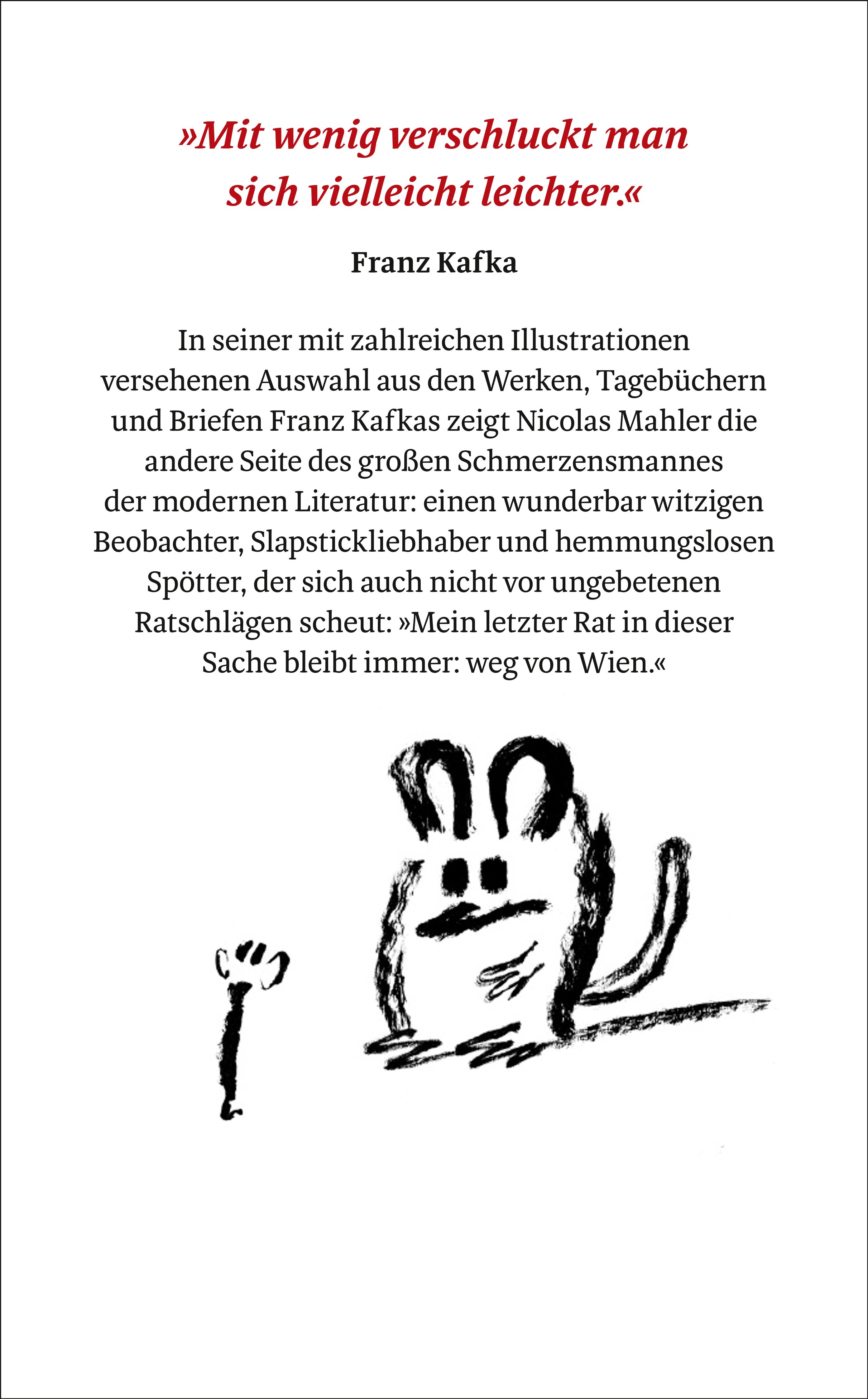 Höchste Zeit also, Kafkas komische Seite zu würdigen. Und wer wäre dafür geeigneter als Nicolas Mahler? In seiner von ihm mit zahlreichen Illustrationen versehenen Auswahl aus den Werken, Tagebüchern und Briefen Kafkas erweist sich dieser wirkungsmächtige Schriftsteller als wunderbar witziger Beobachter und hemmungsloser Spötter, der sich auch nicht vor ungebetenen Ratschlägen scheut: »Mein letzter Rat in dieser Sache bleibt immer: weg von Wien.«