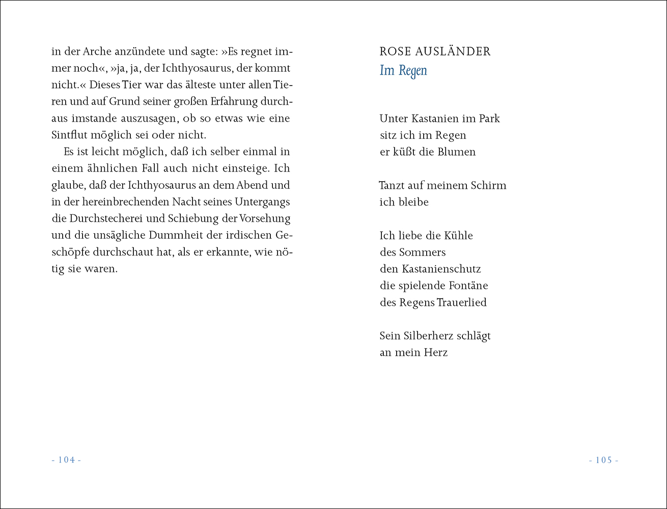 lt;p>Wer hätte das gedacht? Regenwetter, das bedeutete doch eigentlich schlechtes Wetter, »Schmuddelwetter«, Wetter, bei dem man keinen Hund vor die Tür jagte. Heute - in Zeiten der weltweiten Dürre, des Raubbaus an der Natur und des unablässig voranschreitenden Klimawandels - würde man sich an manchen Tagen mehr Regen wünschen, am besten gleich einen Regenmacher! Das kleine Lesebuch versammelt Gedichte und Geschichten vom Regen, als er noch alltäglich zu sein schien. Mascha Kaléko berichtet von einem Wiedersehen mit einer Jugendliebe bei nasser Witterung, Walter Kempowski erinnert sich an einen verregneten Urlaub im Harz. Der erzählerische Regenbogen spannt sich von der biblischen Sintflut bis zum Fußbad im Cabrio. Und die Illustratorin Gerda Raidt hat den literarischen Landregen zusätzlich ins Bild gesetzt.