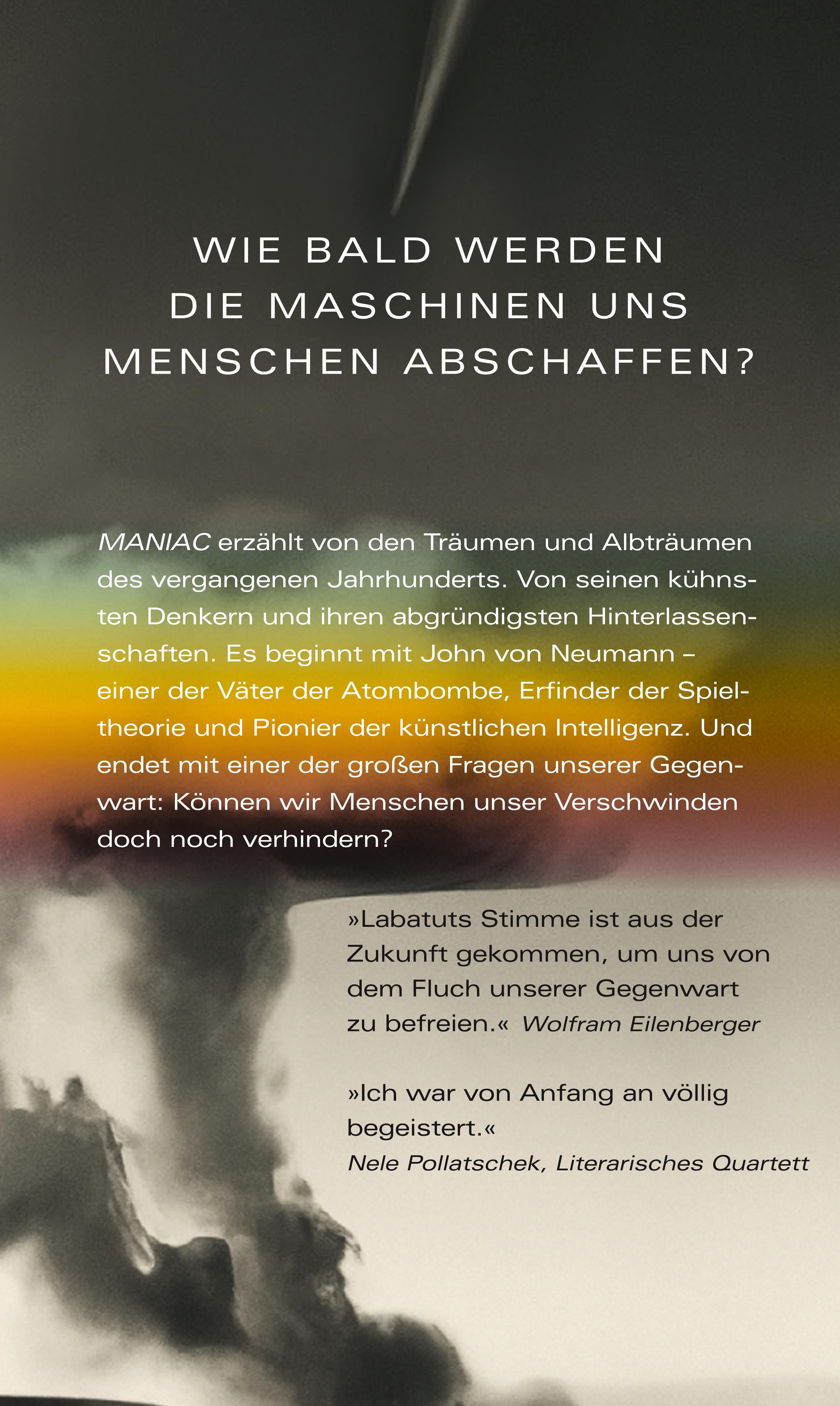 Auf meisterhafte Art verknüpft MANIAC John von Neumanns Schicksal mit dem des gepeinigten Physikers Paul Ehrenfest, der im Deutschland der 1930er Jahre zunehmend panisch den Einzug des tyrannischen Irrationalen vorhersieht, und endet mit einem Zweikampf zwischen Mensch und Maschine: dem weltbesten koreanischen Go-Spieler Lee Sedol und der künstlichen Intelligenz AlphaGo. In ihr kulminiert die Vision von Neumanns: eine autonome Maschine, eine Intelligenz, die sich gänzlich der menschlichen Kontrolle entzieht …