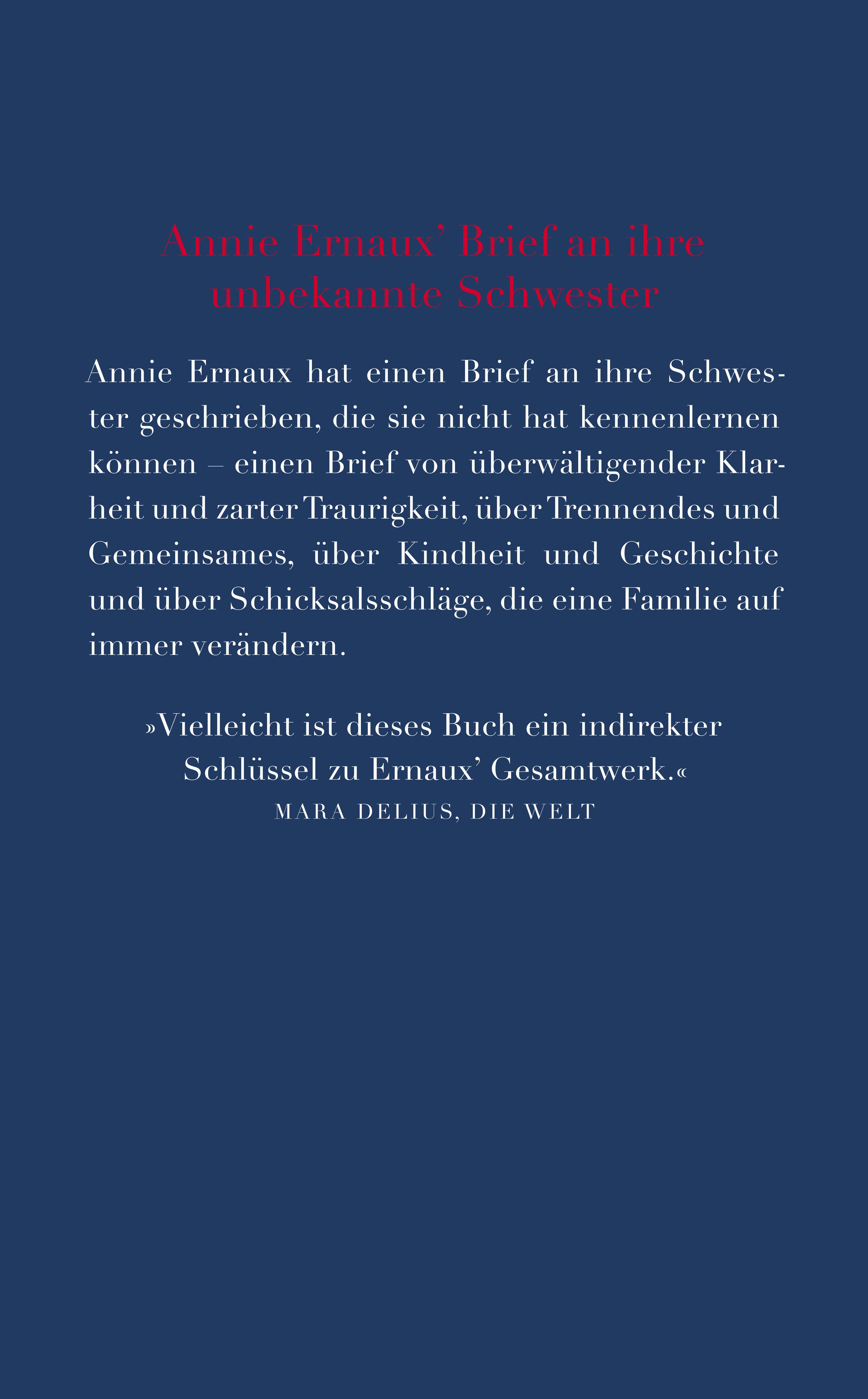 »Weit mehr als nur ein Buch über die Schwester und ein Versuch, ihre Leerstelle in der Geschichte der Familie zu füllen ... Vielleicht ist dieses Buch daher auch ein indirekter Schlüssel zu Ernaux’ Gesamtwerk.«