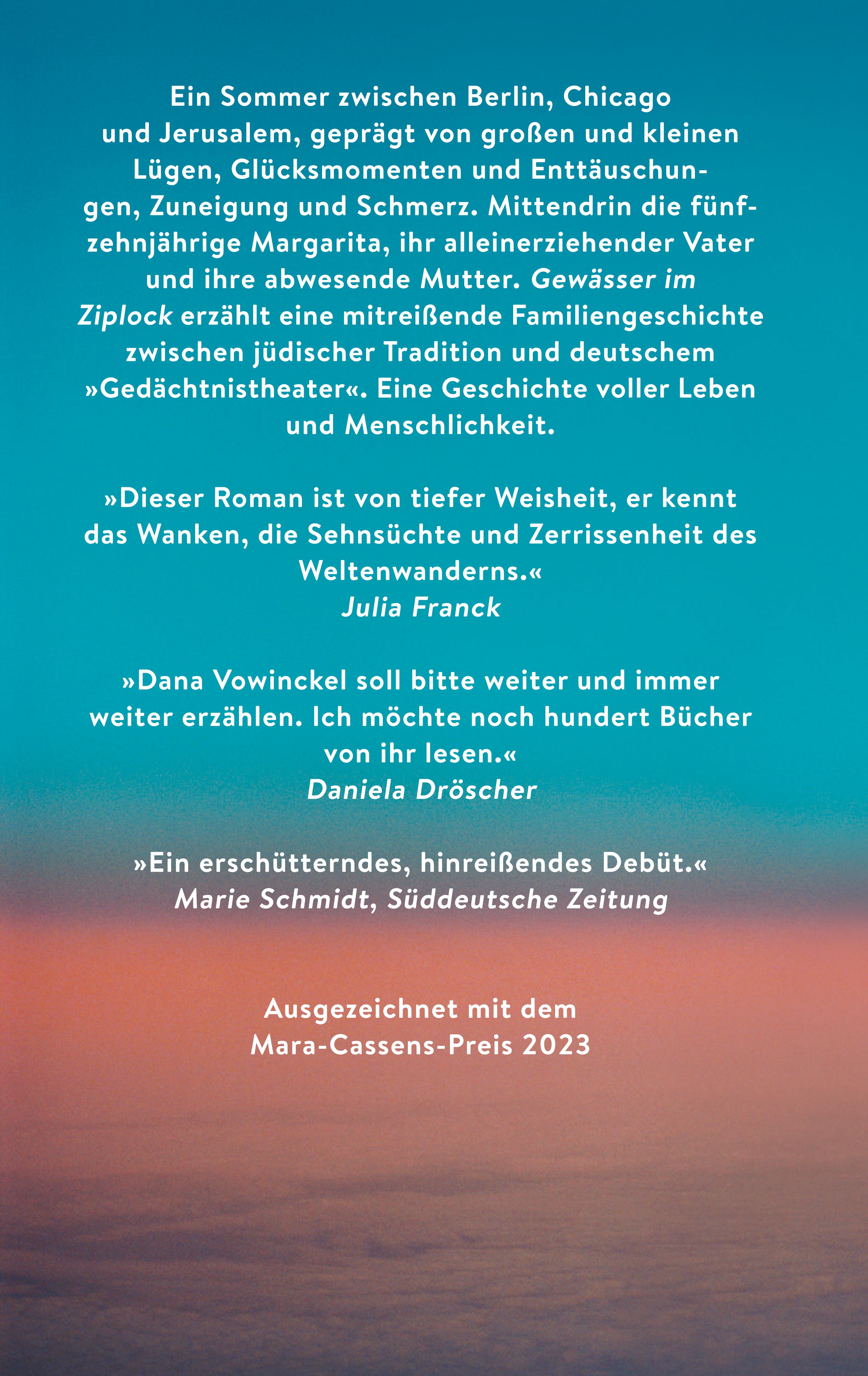 Von großen und kleinen Lügen, Glücksmomenten und Enttäuschungen, von Zuneigung und Schmerz erzählt Dana Vowinckel in ihrem Debütroman. Gewässer im Ziplock ist eine mitreißende Familiengeschichte zwischen jüdischer Tradition und deutschem »Gedächtnistheater«. Eine Geschichte voller Leben und Menschlichkeit.