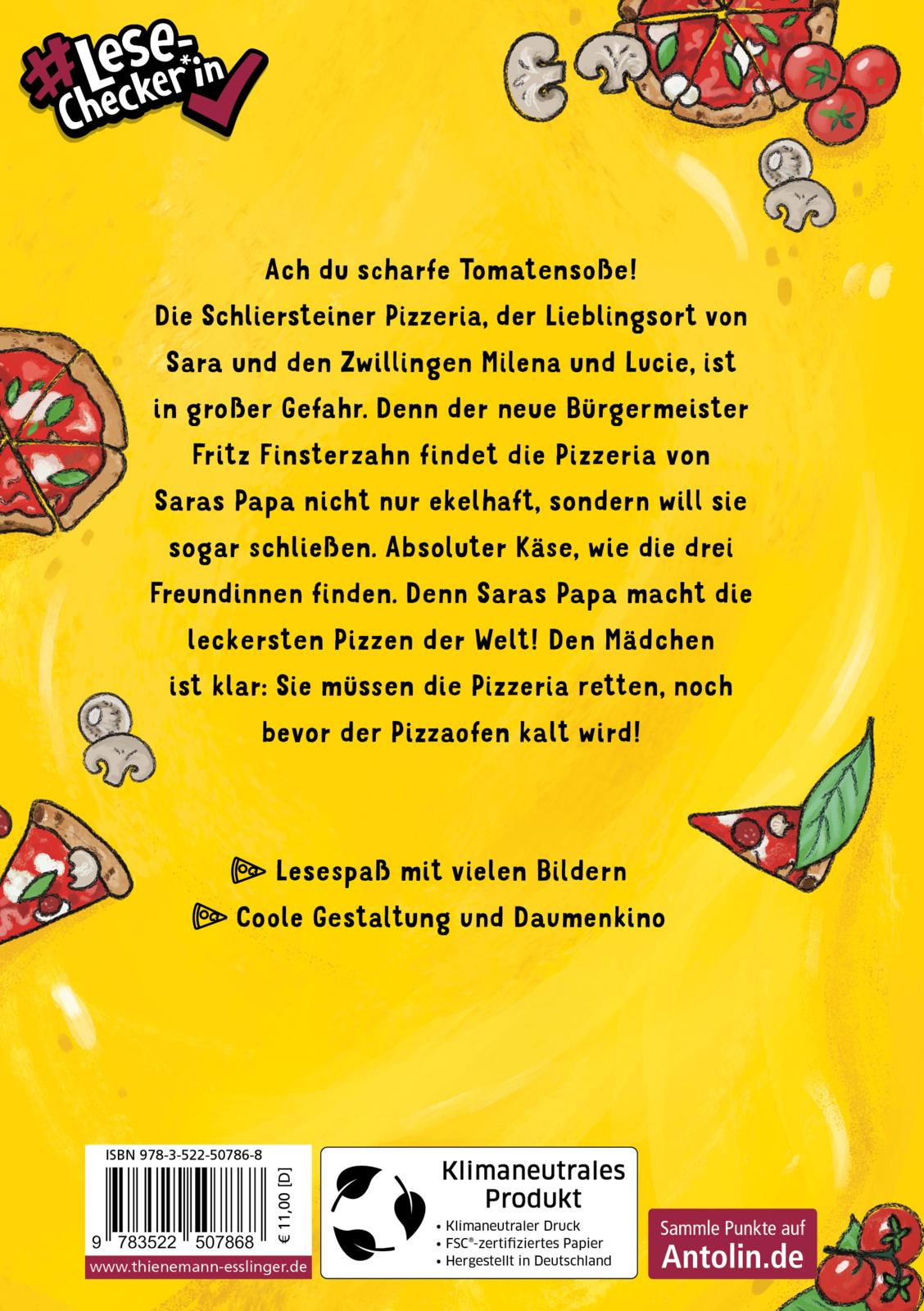 Ach du scharfe Tomatensoße! Die Schliersteiner Pizzeria, der Lieblingsort von Sara und den Zwillingen Milena und Lucie, ist in großer Gefahr. Denn der neue Bürgermeister Fritz Finsterzahn findet die Pizzeria von Saras Papa nicht nur ekelhaft, sondern will sie sogar schließen. Absoluter Käse, wie die drei Freundinnen finden. Denn Saras Papa macht die leckersten Pizzen der Welt! Den Mädchen ist klar: Sie müssen die Pizzeria retten, noch bevor der Pizzaofen kalt wird!