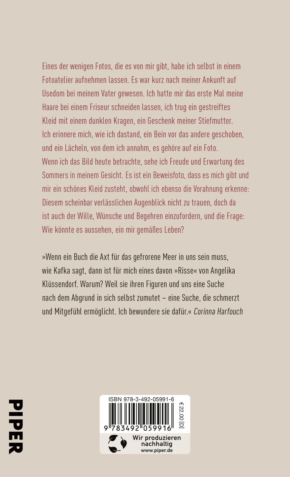 »Wenn ein Buch die Axt für das gefrorene Meer in uns sein muss, wie Kafka sagt, dann ist für mich eines davon "Risse" von Angelika Klüssendorf. Warum? Weil sie ihren Figuren und uns eine Suche nach dem Abgrund in sich selbst zumutet - eine Suche, die schmerzt und Mitgefühl ermöglicht. Ich bewundere sie dafür.« Corinna Harfouch