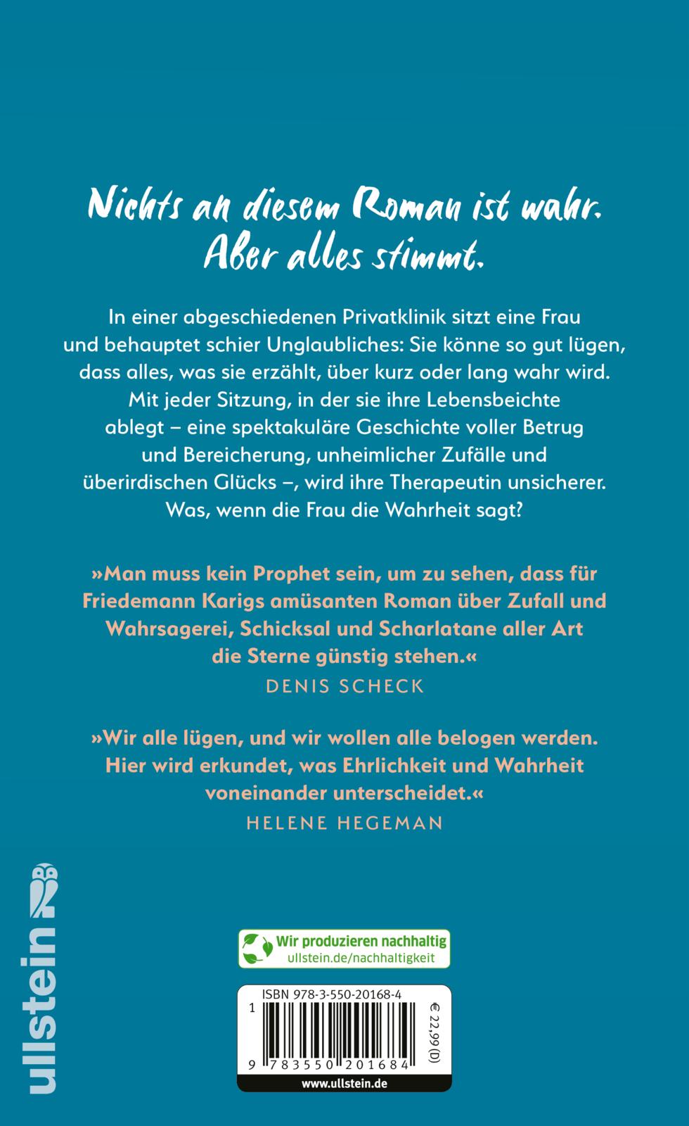 In einer abgeschiedenen Privatklinik sitzt eine Frau und behauptet schier Unglaubliches: Sie könne so gut lügen, dass alles, was sie erzählt, über kurz oder lang wahr wird. Mit jeder Sitzung, in der sie ihre Lebensbeichte ablegt - eine spektakuläre Geschichte voller Betrug und Bereicherung, unheimlicher Zufälle und überirdischen Glücks - wird ihre Therapeutin unsicherer. Was, wenn die Frau die Wahrheit sagt?