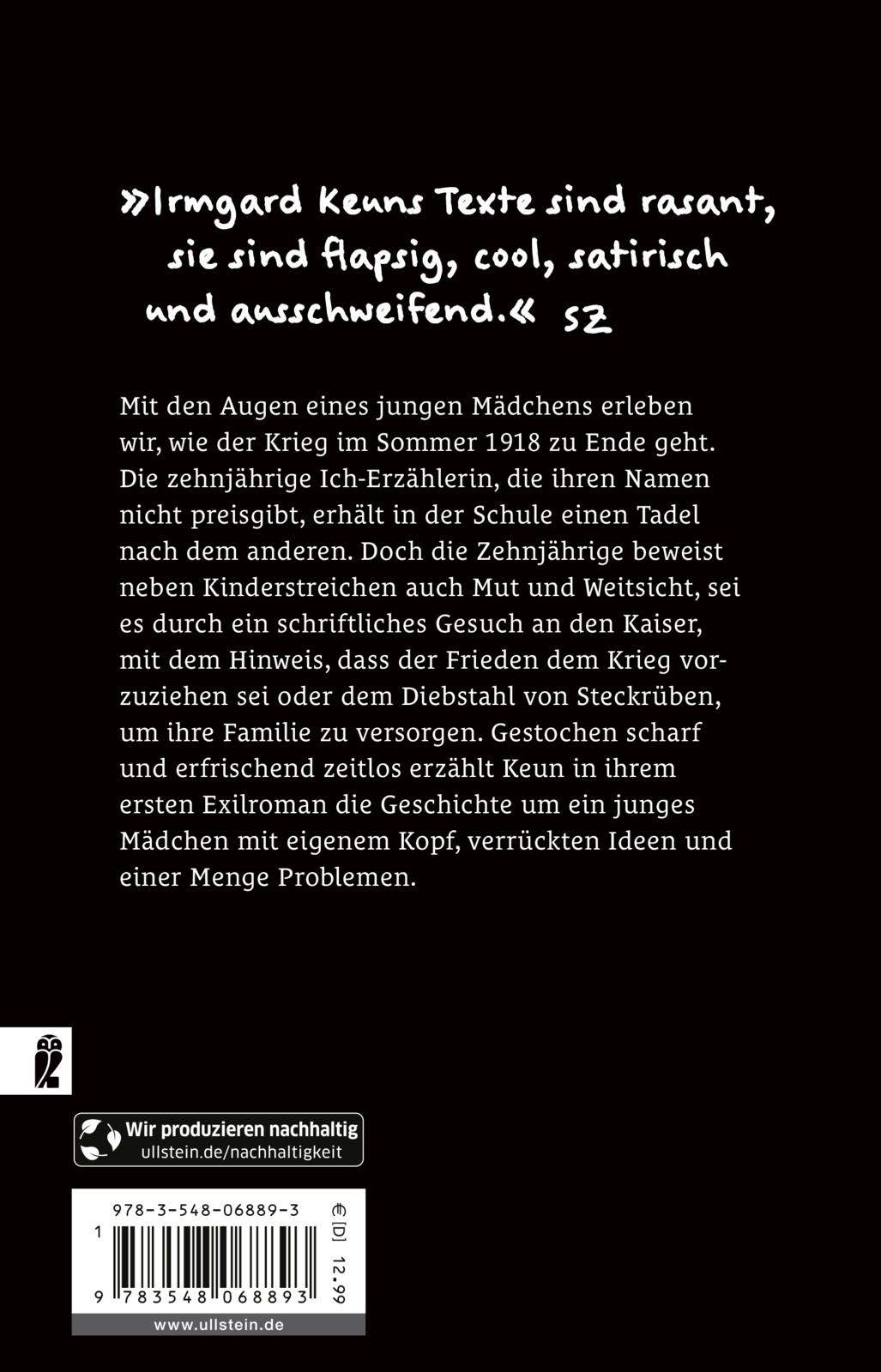 Irmgard Keun, 1905 in Berlin geboren, feierte mit ihren beiden ersten Romanen, Gilgi – eine von uns und Das kunstseidene Mädchen, sensationelle Erfolge. 1936 ging sie ins Exil und kehrte vier Jahre später mit falschen Papieren nach Deutschland zurück, wo sie unerkannt lebte. Im Literaturbetrieb der Nachkriegszeit konnte sie zunächst nicht an die Erfolge ihrer ersten Bücher anknüpfen, bis ihre Romane Ende der Siebzigerjahre von einem breiten Publikum wiederentdeckt wurden. Irmgard Keun starb 1982 und zählt heute zu den wichtigsten deutschsprachigen Autorinnen des 20. Jahrhunderts.