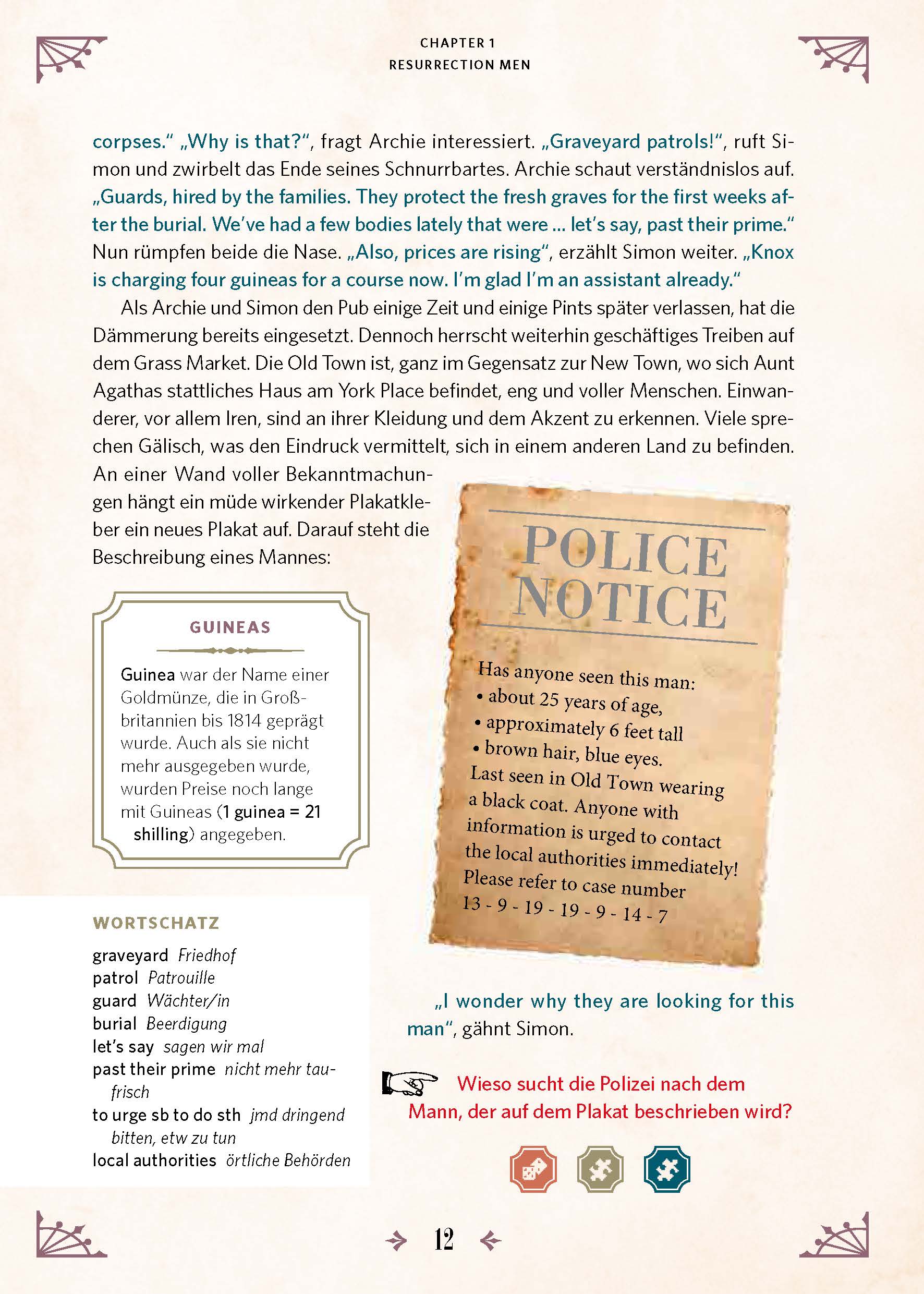 Leichenräuber in Edinburgh, Raubmord in den Highlands - und du mittendrin! Tauche mit Lady Agatha und ihrem neugierigen Neffen Archie tief ein in wahre, mysteriöse Kriminalfälle der Vergangenheit, knacke spannende Rätsel und lerne wie nebenbei Englisch.