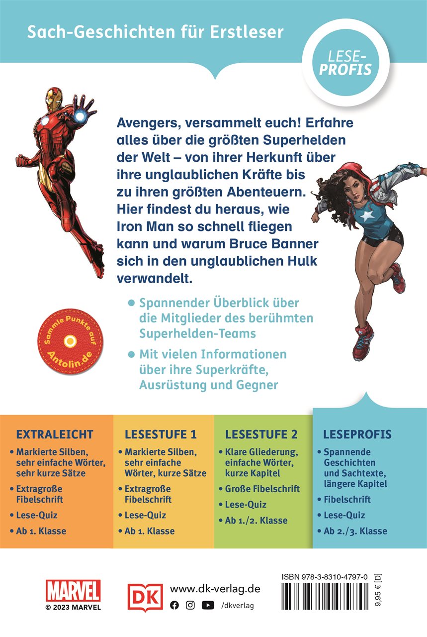 Willkommen in der Welt der größten MARVEL Superhelden! Dieses SUPERLESER!-Erstlesebuch stellt die fantastischen Avengers mit ihren besonderen Kräften und ihrer Ausrüstung vor. Warum kann Iron Man so schnell fliegen und wie funktioniert die Verwandlung des unglaublichen Hulk? Von Captain America, Spider-Man und Co. bis zu gefürchteten Schurken wie Ultron und Thanos: Ein fesselndes MARVEL Buch mit viel Lesefutter, Original-Comic-Illustrationen und Sachwissen für fortgeschrittene Bücherwürmer.