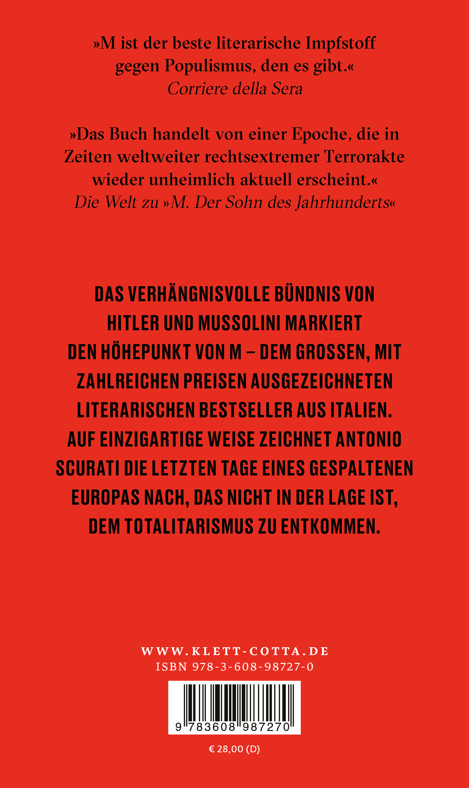 Das verhängnisvolle Bündnis von Hitler und Mussolini markiert den Höhepunkt von M - dem großen, mit zahlreichen Preisen ausgezeichneten literarischen Bestseller aus Italien. Auf einzigartige Weise zeichnet Antonio Scurati die letzten Tage eines gespaltenen Europas nach, das nicht in der Lage ist, dem Totalitarismus zu entkommen.