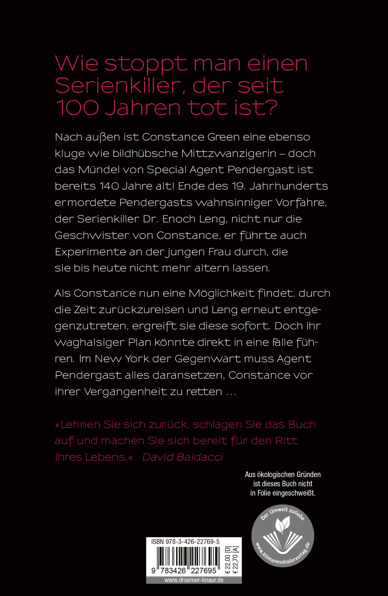 Nach außen ist Constance Green eine ebenso kluge wie bildhübsche Mittzwanzigerin - doch das Mündel von Special Agent Pendergast ist 140 Jahre alt! Ende des 19. Jahrhunderts ermordete Pendergast wahnsinniger Vorfahre, der Serienkiller Dr. Enoch Leng, nicht nur die Geschwister von Constance, er führte auch düstere Experimente an der jungen Frau durch, die sie bis heute nicht mehr altern lassen. Als Constance nun eine Möglichkeit findet, durch die Zeit zurückzureisen und Leng erneut entgegenzutreten, ergreift sie diese sofort. Doch ihr waghalsiger Plan könnte direkt in eine Falle führen. Im New York der Gegenwart muss Agent Pendergast alles daran setzen, Constance vor ihrer Vergangenheit zu retten ...