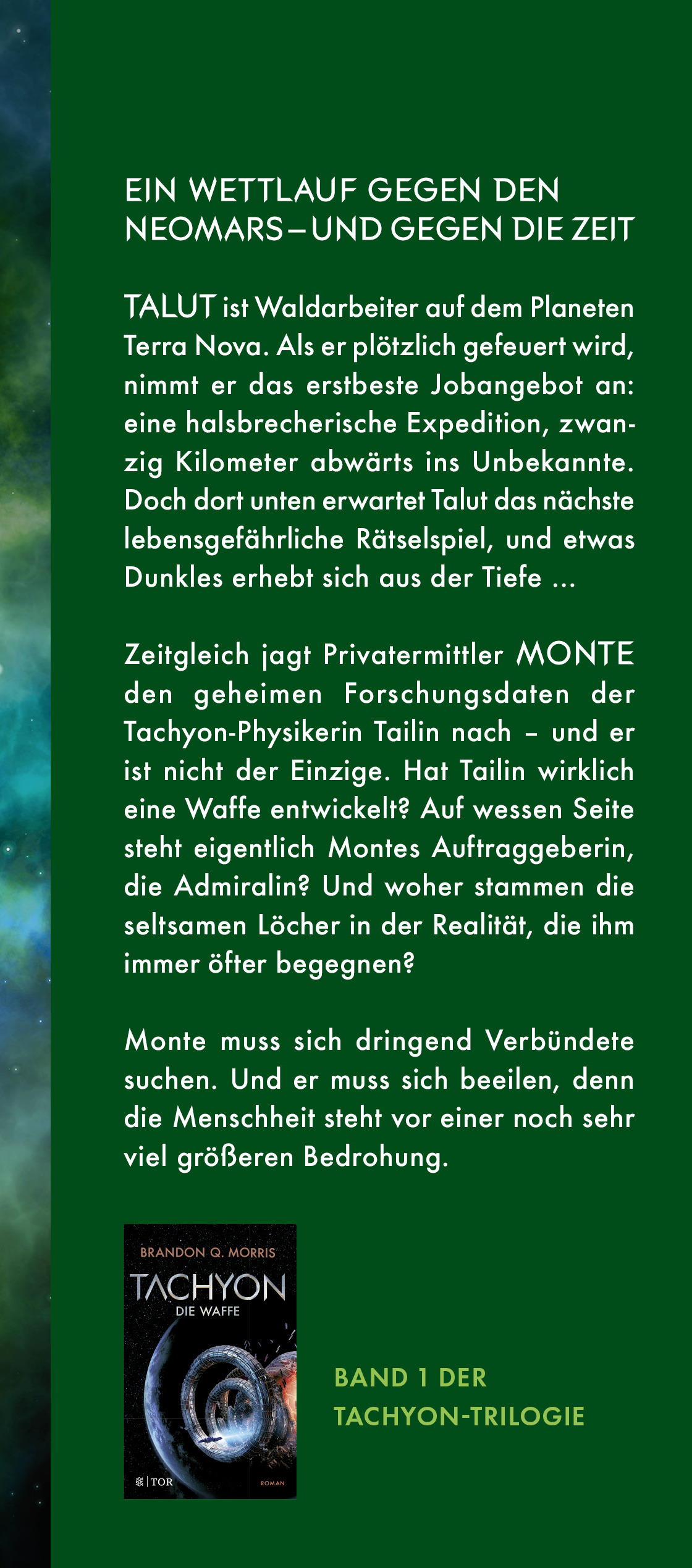 Zeitgleich jagt Privatermittler Monte den geheimen Forschungsdaten der Tachyon-Physikerin Tailin nach - und er ist nicht der Einzige. Hat Tailin wirklich eine Waffe entwickelt? Auf wessen Seite steht eigentlich Montes Auftraggeberin, die Admiralin? Und woher stammen die seltsamen Löcher in der Realität, die ihm immer öfter begegnen?