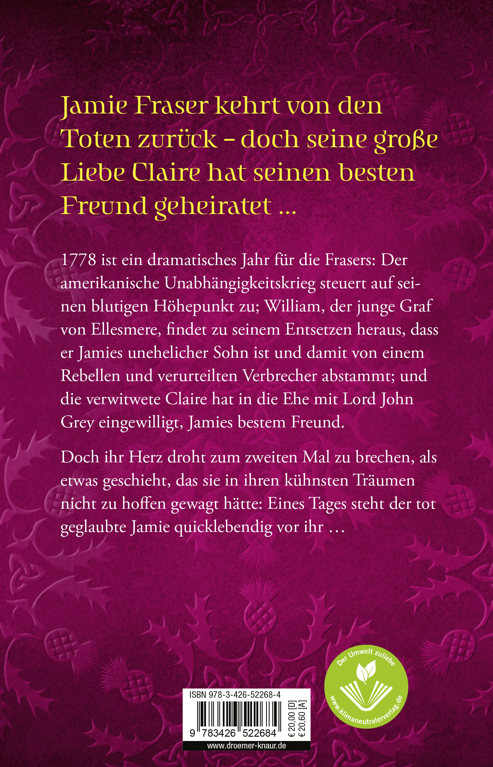 1778 ist ein dramatisches Jahr für die Frasers: Der amerikanische Unabhängigkeitskrieg steuert auf seinen blutigen Höhepunkt zu; William, der junge Graf von Ellesmere, findet zu seinem Entsetzen heraus, dass er Jamies unehelicher Sohn ist und damit von einem Rebellen und verurteilten Verbrecher abstammt; und die verwitwete Claire hat in die Ehe mit Lord John Grey eingewilligt, Jamies bestem Freund. Ihr Herz droht zum zweiten Mal zu brechen, als etwas geschieht, das sie in ihren kühnsten Träumen nicht zu hoffen gewagt hätte: Eines Tages steht der totgeglaubte Jamie quicklebendig vor ihr.