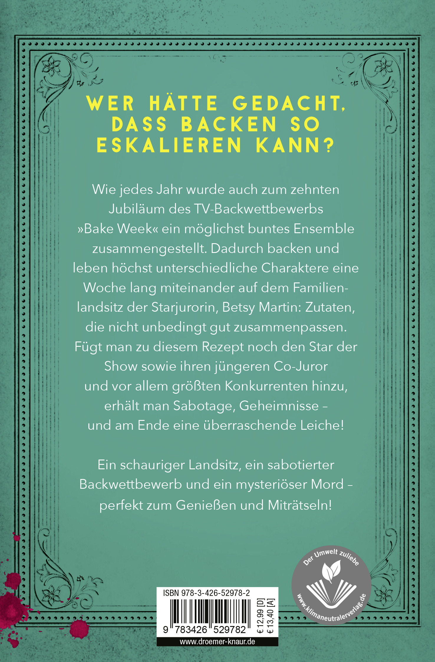 Betsy Martin, Starköchin und Jurorin, öffnet zum zehnten Mal ihre Türen für die "Bake Week", einen erfolgreichen Backwettbewerb eines bekannten Streamingdiensts. Mit dem Fernsehteam, den Teilnehmern und Teilnehmerinnen muss sie dieses Jahr auch einen zweiten, jüngeren Juror auf ihrem Landsitz und Elternhaus Grafton Manor willkommen heißen - ihre Begeisterung über die Konkurrenz hält sich allerdings in Grenzen. Das Ensemble des Wettbewerbs ist wie stets bunt gemischt: Neben einer großmütterlichen älteren Dame sind ein wissenschaftlicher Perfektionist, eine ehrgeizige junge Frau, ein gelangweilter Start-up-Millionär, ein Familienvater und eine labile Hobbybäckerin vertreten. Doch hinter den Fassaden - nicht nur des Hauses, sondern auch der Menschen - verbergen sich Rätsel und Geheimnisse. Kleine Sabotageakte eskalieren und es kommt, wie es kommen muss: Bald liegt eine Leiche am Set.