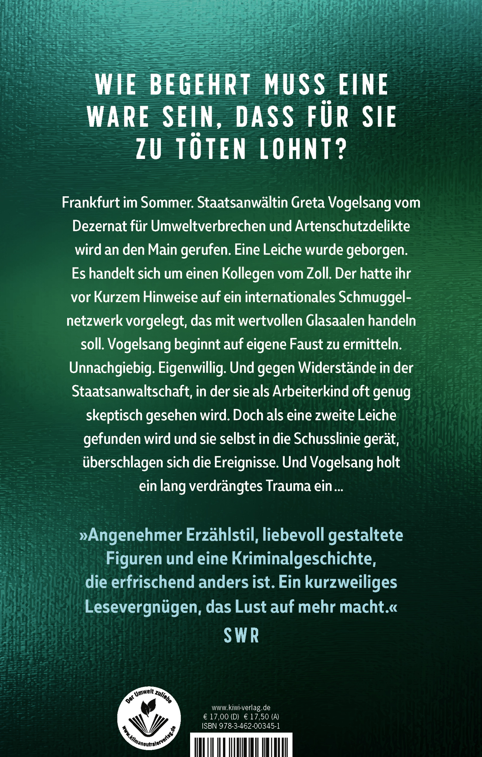 Ein toter Zollfahnder im Main. Ein kleiner Fisch von verdammt großem Wert. Und eine ungewöhnliche Ermittlerin mit eigenem Kopf und brisanter Vergangenheit. »Die Spur der Aale« ist der packende erste Fall für die Frankfurter Staatsanwältin Greta Vogelsang vom Dezernat für Umweltverbrechen und Artenschutzdelikte.
