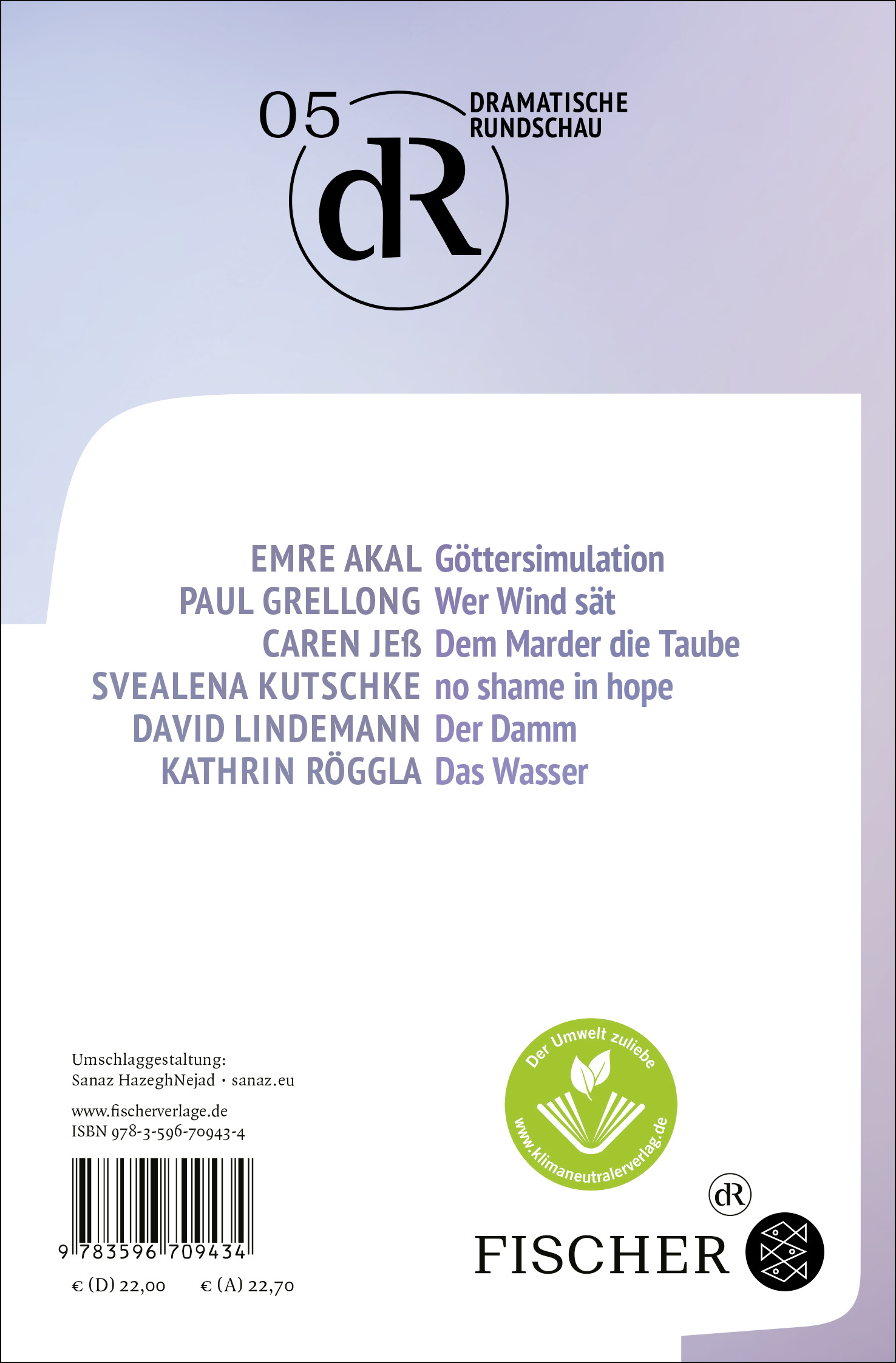 Emre Akal: Göttersimulation / Paul Grellong: Wer Wind sät / Caren Jeß: Dem Marder die Taube / Svealena Kutschke: no shame in hope / David Lindemann: Der Damm / Kathrin Röggla: Das Wasser