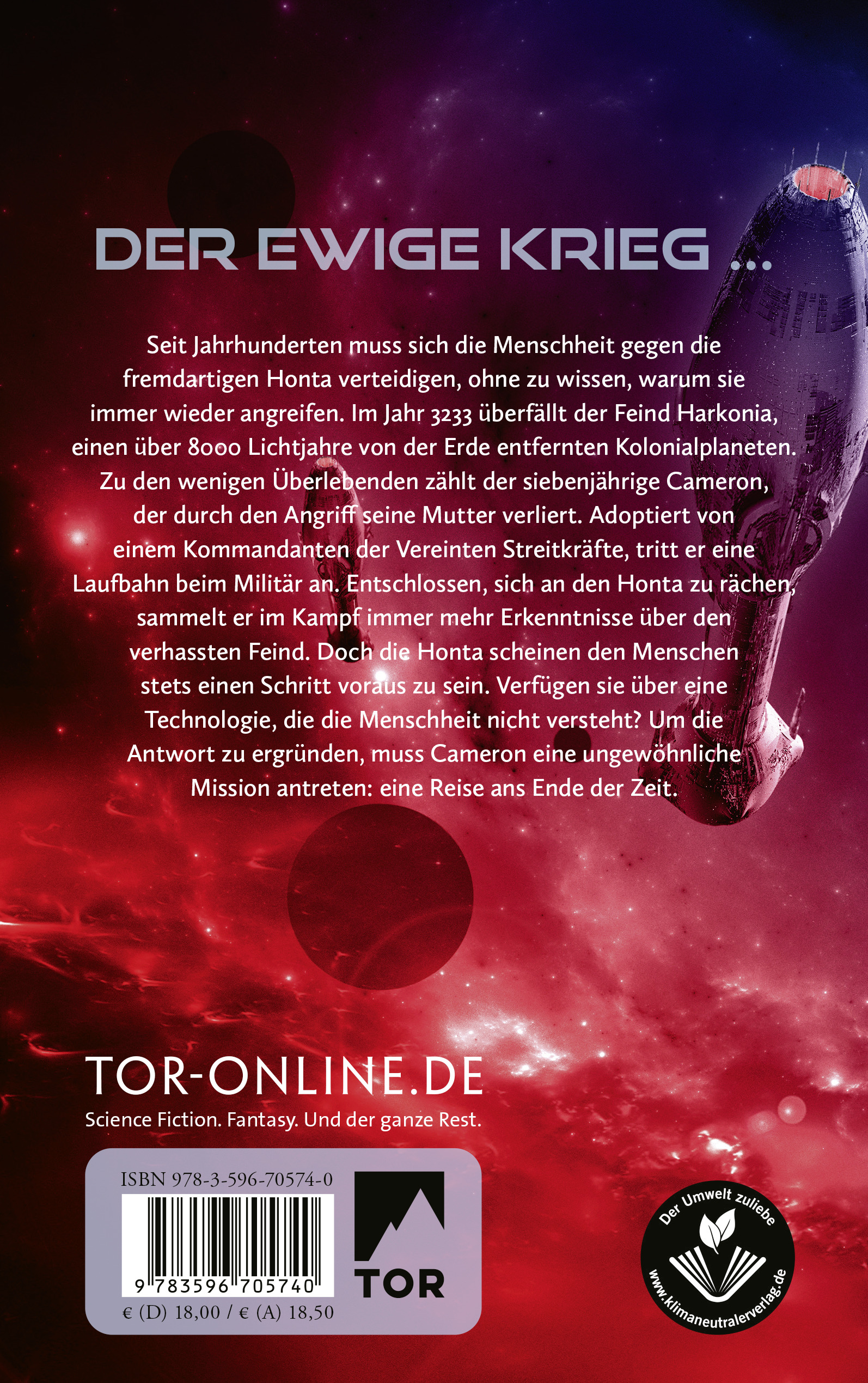 Seit Jahrhunderten muss sich die Menschheit gegen die fremdartigen Honta verteidigen, ohne zu wissen, warum sie immer wieder angreifen. Im Jahr 3233 überfällt der Feind Harkonia, einen über 8000 Lichtjahre von der Erde entfernten Kolonialplaneten. Zu den wenigen Überlebenden zählt der siebenjährige Cameron, der durch den Angriff seine Mutter verliert. Adoptiert von einem Kommandanten der Vereinten Streitkräfte, tritt er eine Laufbahn beim Militär an. Entschlossen, sich an den Honta zu rächen, sammelt er im Kampf immer mehr Erkenntnisse über den verhassten Feind. Doch die Honta scheinen den Menschen stets einen Schritt voraus zu sein. Verfügen sie über eine Technologie, die die Menschheit nicht versteht? Um die Antwort zu ergründen, muss Cameron eine ungewöhnliche Mission antreten: eine Reise ans Ende der Zeit.
