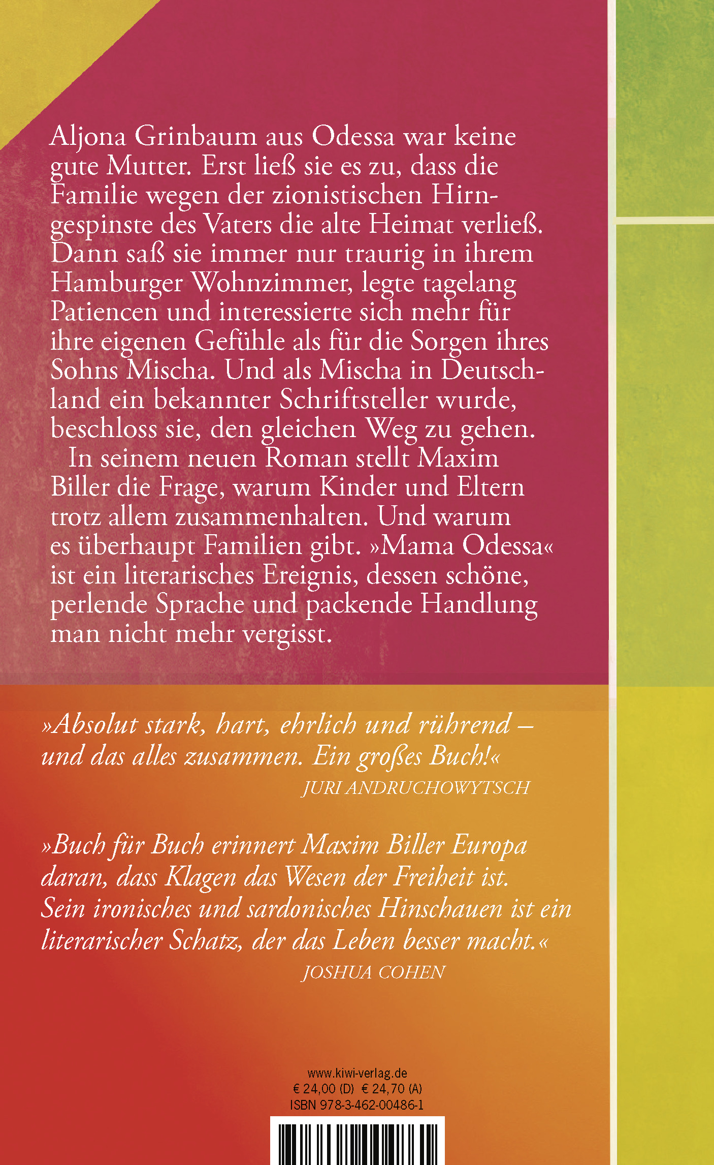 | Schlagworte | Affäre • Autofiktion • Der falsche Gruß • Esra • Familien-Beziehungen • Familiengeheimnis • Familienkonflikt • Gesellschaftsroman • Jüdische Familiengeschichte • Literaturbetrieb • Maxim Biller neuer Roman • Mutter-Sohn-Beziehung • Mythologie • Neuer Biller • Odessa • Politische Literatur • Sechs Koffer • Sowjetunion |