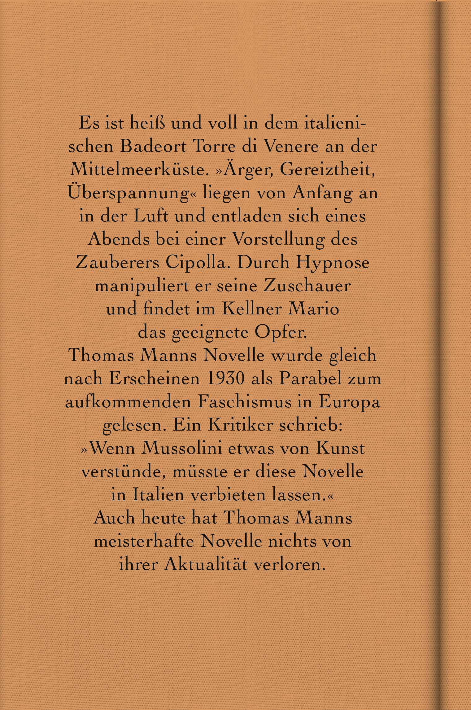 Torre di Venere, Mitte August: Es ist heiß und voll in dem italienischen Badeort an der Mittelmeerküste. Der Strand ist fest in der Hand der »inländischen Mittelklasse«, die sich als wenig gastfreundlich und anstrengend patriotisch erweist. »Ärger, Gereiztheit, Überspannung« liegen von Anfang an in der Luft und entladen sich eines Abends bei einer Vorstellung des Zauberers Cipolla. Durch Hypnose manipuliert Cipolla seine Zuschauer und findet im Kellner Mario das geeignete Opfer, das sich ihm willenlos unterwerfen soll ... Thomas Manns 1930 erschienene Novelle wurde gleich nach Erscheinen als politische Parabel zum aufkommenden Faschismus in Europa gelesen. Ein zeitgenössischer Kritiker schrieb: »Wenn Mussolini etwas von Kunst verstünde, müsste er diese Novelle in Italien verbieten lassen.« Auch heute hat Thomas Manns meisterhafte Novelle nichts von ihrer Aktualität verloren.