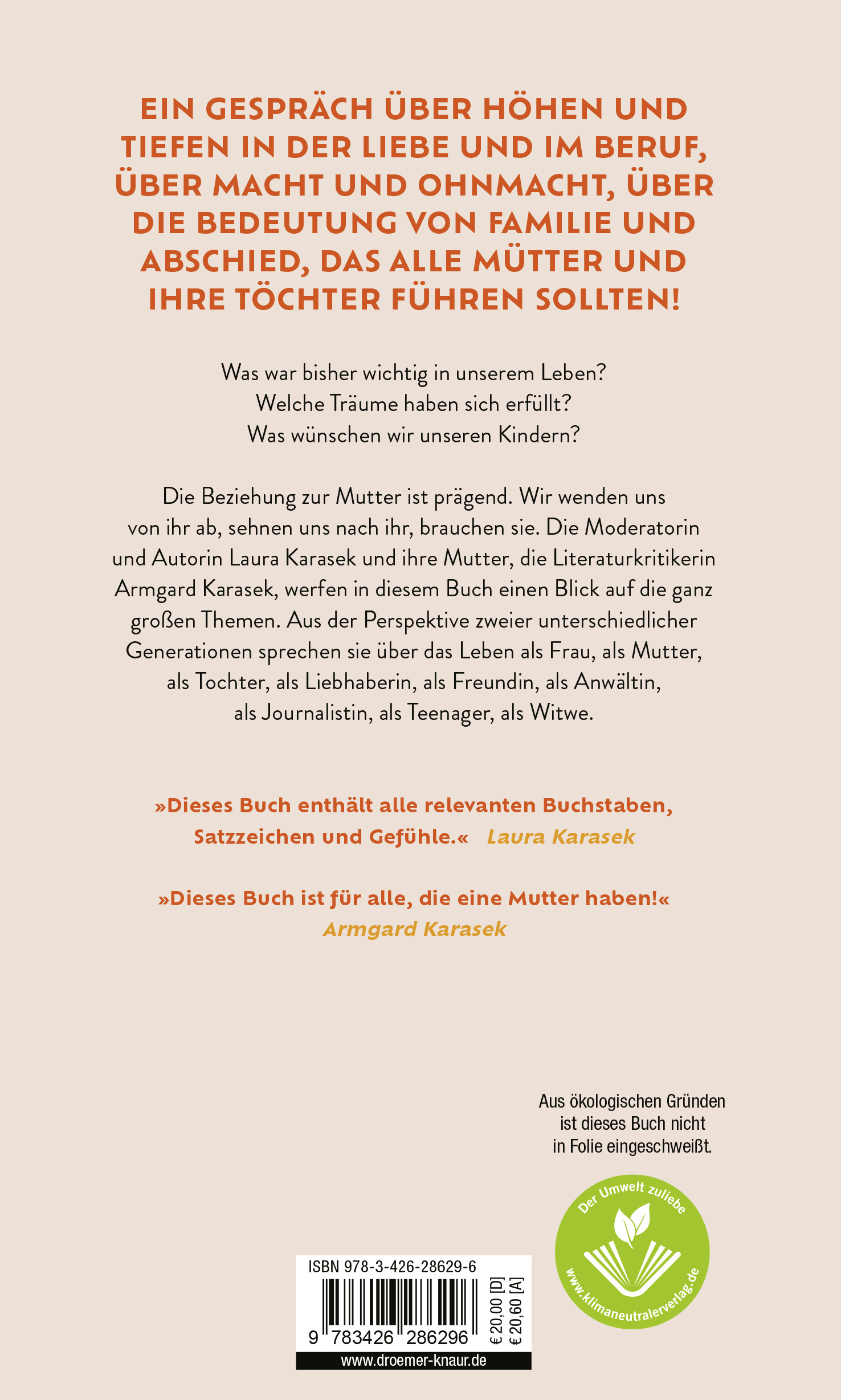 Laura Karasek und ihre Mutter, Armgard Karasek, sprechen in diesem Buch mit Blick aus zwei unterschiedlichen Generationen über das Leben als Frau, als Mutter, als Tochter, als Liebhaberin, als Freundin, als Anwältin, als Journalistin, als Teenager, als Witwe. Berührend offen, mitunter schonungslos, aber immer liebevoll stellen sich die beiden Frauen in einem unterhaltsamen und intimen Dialog jenen Fragen, die uns alle bewegen.
