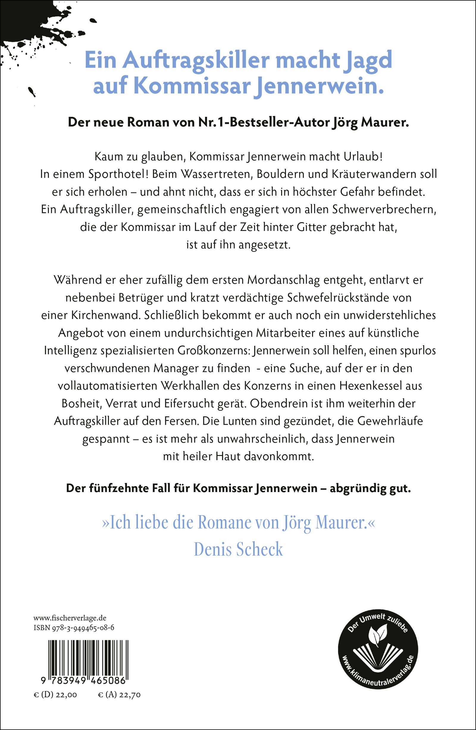 Kaum zu glauben, Kommissar Jennerwein macht Urlaub! In einem Sporthotel! Beim Wassertreten, Bouldern und Kräuterwandern soll er sich erholen - und ahnt nicht, dass er sich in höchster Gefahr befindet. Ein Auftragskiller, gemeinschaftlich engagiert von allen Schwerverbrechern, die der Kommissar im Lauf der Zeit hinter Gitter gebracht hat, ist auf ihn angesetzt.