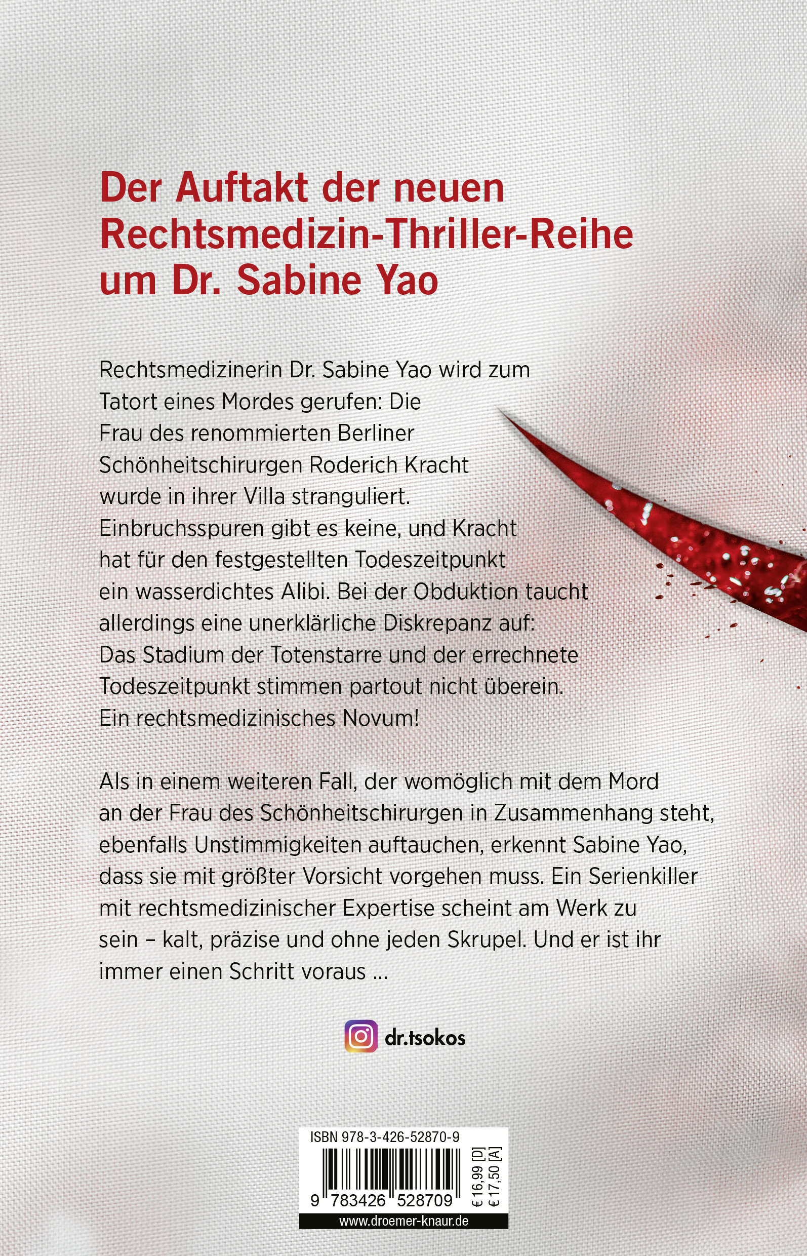 Aber es tauchen Unstimmigkeiten auf, denn das Stadium der Totenstarre des Opfers sorgt für große Irritationen und lässt alle Experten am festgelegten Todeszeitpunkt zweifeln. Ein rechtsmedizinisches Novum: Totenstarre und die errechnete Todeszeit stimmen partout nicht überein. Als in einem weiteren Fall, der möglicherweise mit dem Mord in Zusammenhang steht, ebenfalls Unstimmigkeiten auftreten, erkennt Sabine Yao, dass sie von nun an mit größter Vorsicht vorgehen muss. Offensichtlich ist ein Serienkiller mit rechtsmedizinischer Expertise am Werk, der Yao immer einen Schritt voraus ist. Mit der Unterstützung ihres Chefs und Mentors Prof. Paul Herzfeld und der IT-Spezialistin Sara Wittstock gelingt es Yao schließlich, dem Täter und seinen perfiden Taten immer weiter auf die Spur zu kommen. Doch der Mörder schreckt vor nichts zurück und lockt die Rechtsmedizinerin in eine tödliche Falle ...