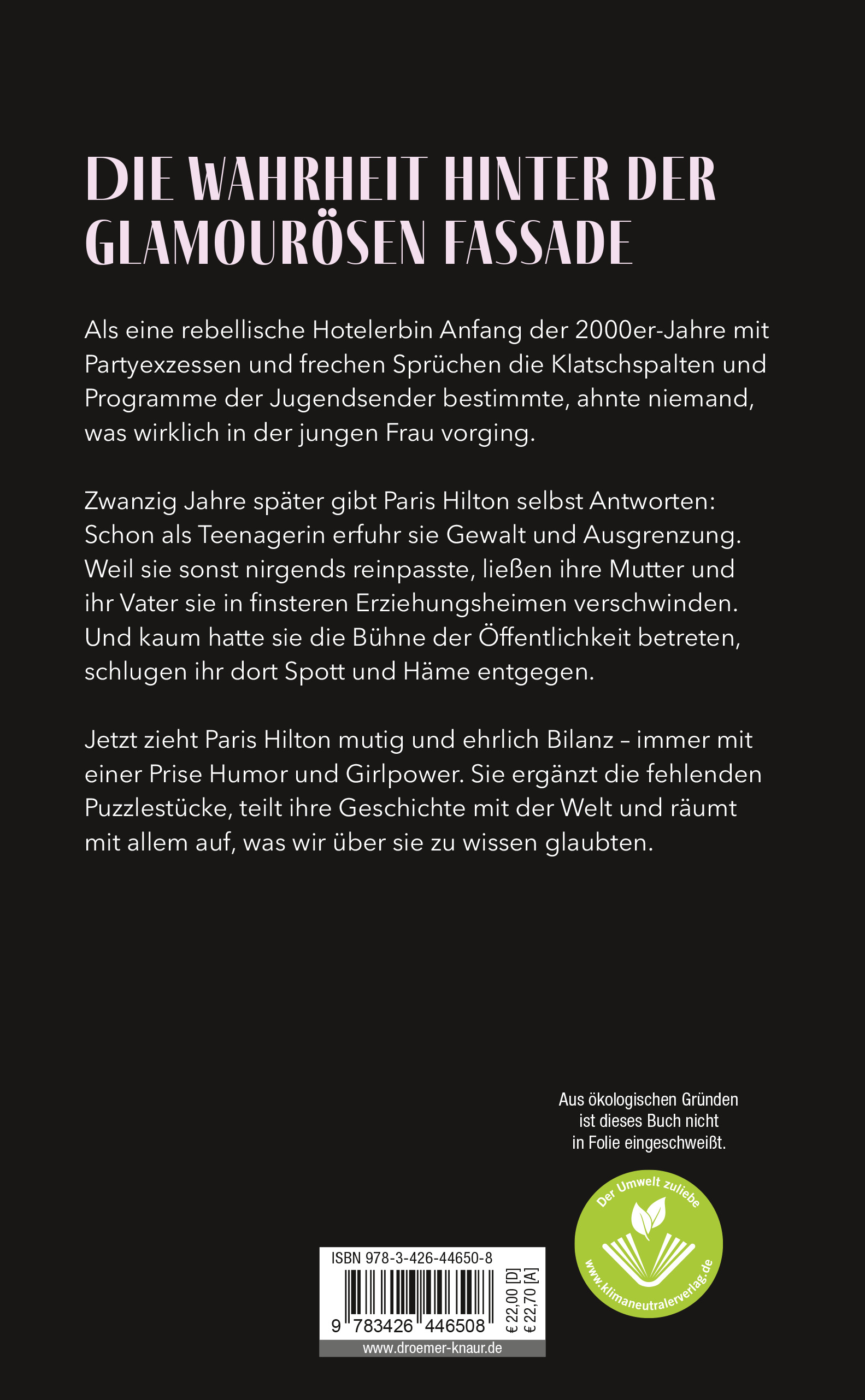 Jetzt endlich zieht Paris Hilton mit Mut, Ehrlichkeit und jeder Menge Humor Bilanz, ergänzt die fehlenden Puzzlestücke und teilt ihre Geschichte mit der Welt. Indem sie die Rolle von ihrer Urheberin, die Marke von ihrer Botschafterin trennt, räumt sie auf mit allem, was wir über sie zu wissen dachten. Sie nimmt uns mit in eine privilegierte Kindheit, die sie durch das Brennglas einer undiagnostizierten ADHS erlebte. Ihre Rebellion als Teenagerin führte zu einer panischen und gefährlichen Reaktion ihrer Eltern: Weil man sie glauben machte, dass sie nur so das Leben ihrer Tochter retten könnten, ließen Paris' Mutter und Vater sie kidnappen und in mehrere 'Internate für emotionales Wachstum' sperren, in denen sie fast zwei Jahre lang verbalen, körperlichen und sexuellen Missbrauch erlitt. Inmitten jener Hölle, die wir heute unter dem Namen 'Problemkind-Industrie' kennen, erschuf Paris eine schöne innere Welt, in der die Hässlichkeit ihrer Umgebung sie nicht erreichte. Als sie endlich wieder freikam, vertraute sie niemandem mehr außer sich selbst und verwandelte ihre Fantasiewelt in eine milliardenschwere Realität.
