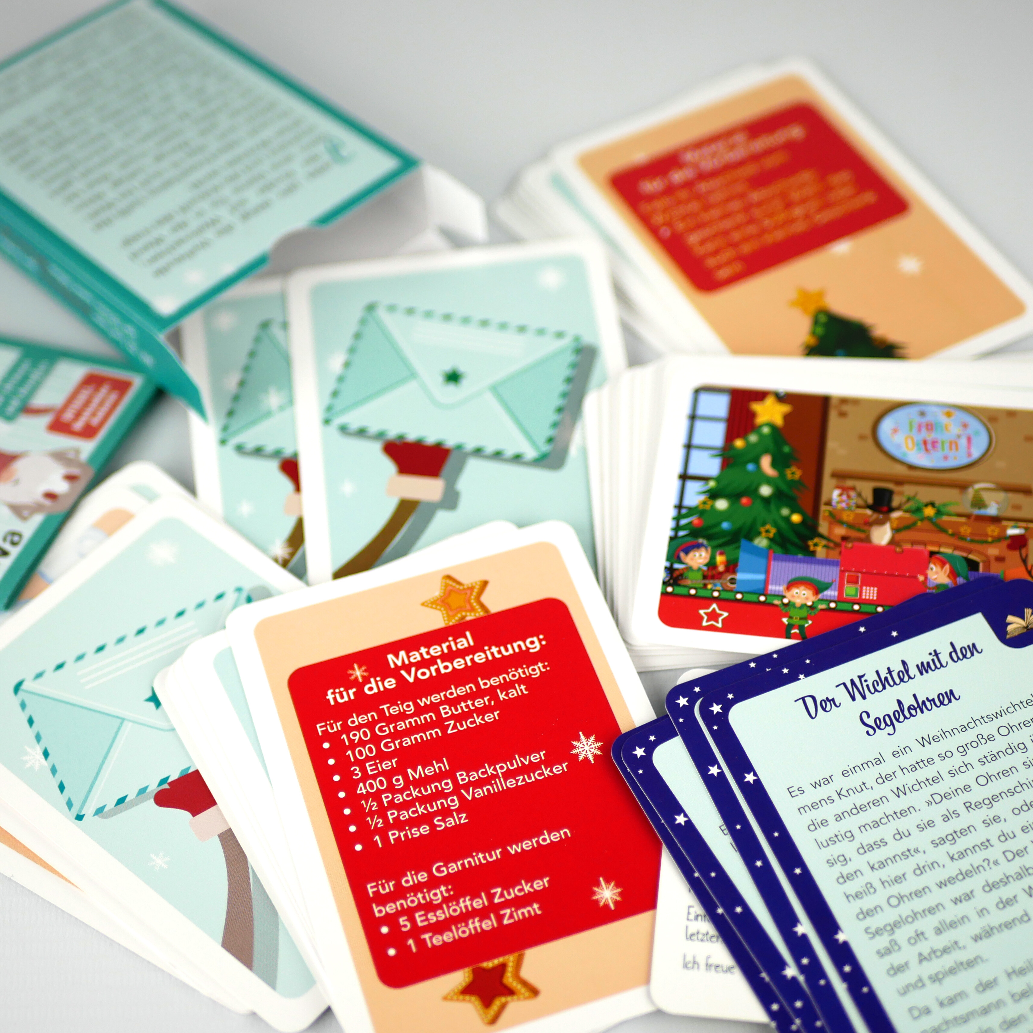 Wenn der Wichtel einziehtJedes Jahr steigt die Vorfreude der Kinder auf Weihnachten, wenn eine kleine Tür in der Wand erscheint und die Ankunft des magischen Wichtels verrät. Für die Eltern heißt das jedoch auch, dass sie sich bis Weihnachten jede Menge lustige Aktionen einfallen lassen müssen. Mit diesem Kartenset geht das ganz leicht.Dieses Kartenset enthält:· Eine ausführliche Anleitung für die Erwachsenen· Rote Anleitungskarten für die Erwachsenen· Blaue Wichtelbriefe für die Kinder· Viele tolle Aufgaben, spannende Rätsel, weihnachtliche Geschichten und vieles mehr· Spaßige Aktionen für drinnen und draußen· Inklusive Postkarte für die Wichtelgrüße nach Weihnachten Egal, ob der Wichtel kleine Streiche spielen, zu Aktivitäten anregen oder ein Rätsel stellen soll, hier ist für jeden von euch etwas dabei. So lässt sich der Wichtel-Trend ganz einfach umsetzen und die Zeit bis Weihnachten vergeht wie im Flug.Die Wichtelbriefe können Tag für Tag vor der Wichteltür platziert werden und sorgen so für eine abwechslungsreiche Adventszeit - und das ganz ohne viel Vorbereitung oder Zeitaufwand.