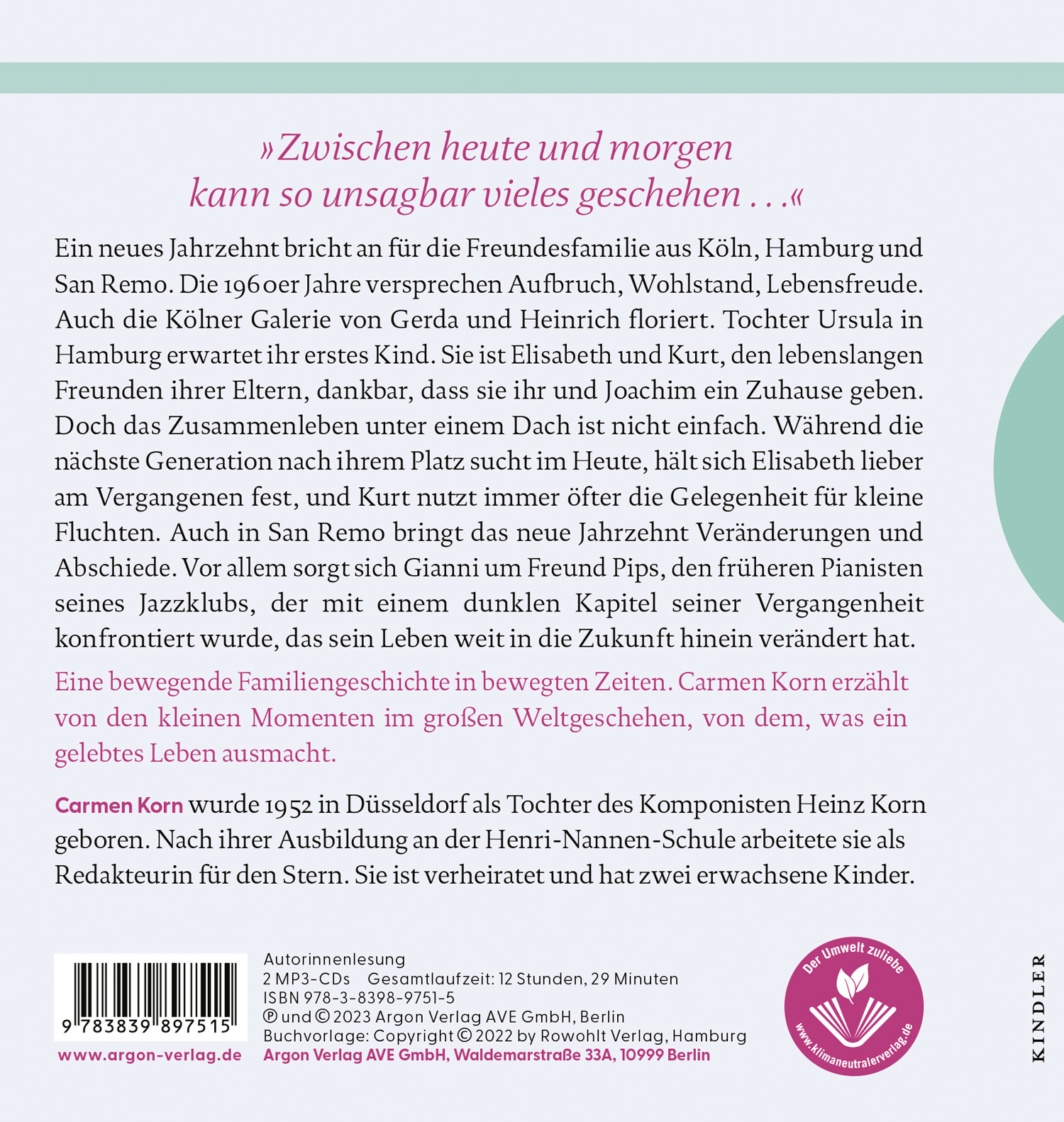 Ein neues Jahrzehnt bricht an für die Freundesfamilie aus Köln, Hamburg und San Remo. Die 1960er Jahre versprechen Aufbruch, Wohlstand, Lebensfreude. Auch die Kölner Galerie von Gerda und Heinrich floriert. Tochter Ursula in Hamburg erwartet ihr erstes Kind. Sie ist Elisabeth und Kurt, den lebenslangen Freunden ihrer Eltern, dankbar, dass sie ihr und Joachim ein Zuhause geben. Doch das Zusammenleben unter einem Dach ist nicht einfach. Während die nächste Generation nach ihrem Platz sucht im Heute, hält sich Elisabeth lieber am Vergangenen fest, und Kurt nutzt immer öfter die Gelegenheit für kleine Fluchten. Auch in San Remo bringt das neue Jahrzehnt Veränderungen und Abschiede. Vor allem sorgt sich Gianni um Freund Pips, den früheren Pianisten seines Jazzklubs, der mit einem dunklen Kapitel seiner Vergangenheit konfrontiert wurde, das sein Leben weit in die Zukunft hinein verändert hat.