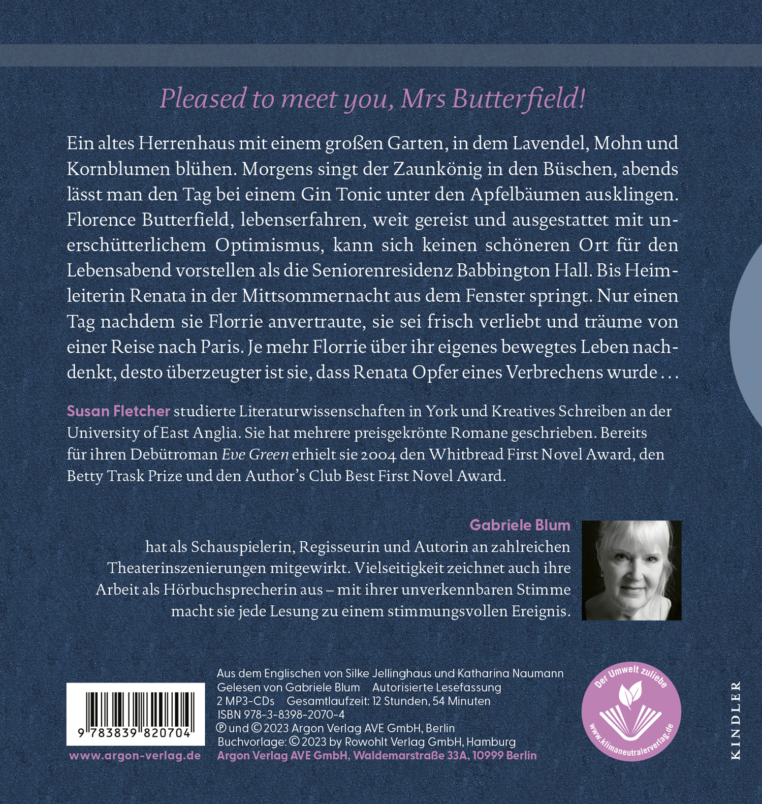 Ein altes Herrenhaus mit einem großen Garten, in dem Lavendel, Mohn und Kornblumen blühen. Morgens singt der Zaunkönig in den Büschen, abends lässt man den Tag bei einem Gin Tonic unter den Apfelbäumen ausklingen. Florence Butterfield, lebenserfahren, weit gereist und ausgestattet mit unerschütterlichem Optimismus, kann sich keinen schöneren Ort für den Lebensabend vorstellen als die Seniorenresidenz Babbington Hall. Bis Heimleiterin Renata in der Mittsommernacht aus dem Fenster springt. Nur einen Tag nachdem sie Florrie anvertraute, sie sei frisch verliebt und träume von einer Reise nach Paris. Je mehr Florrie über ihr eigenes bewegtes Leben nachdenkt, desto überzeugter ist sie, dass Renata Opfer eines Verbrechens wurde ...