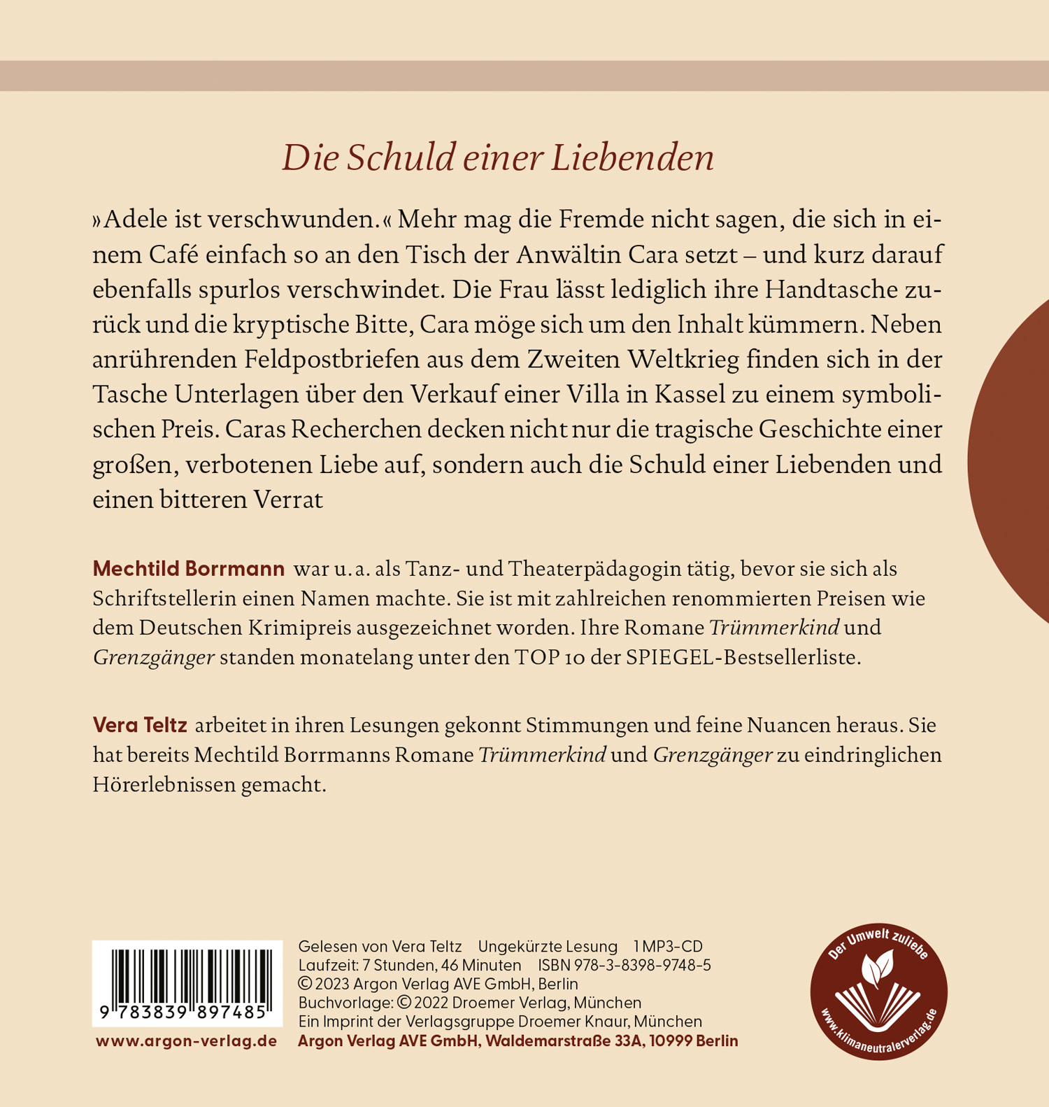 Vera Teltz arbeitet in ihren Lesungen gekonnt Stimmungen und feine Nuancen heraus. Sie hat bereits Mechtild Borrmanns Romane Trümmerkind und Grenzgänger zu eindringlichen Hörerlebnissen gemacht.
