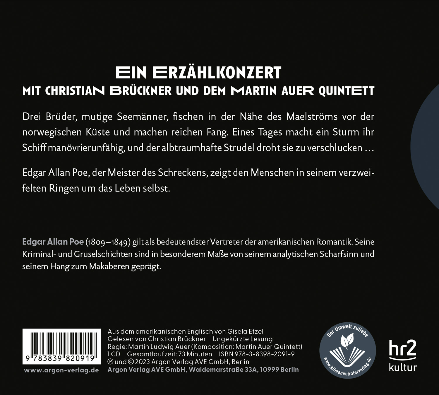 | Schlagworte | 19. Jahrhundert • amerikanische Romantik • Christian Brückner • frühe Science-Fiction • Macht der Natur • Meer • Meister des Schreckens • Nominierung Deutscher Jazzpreis 2024 • Nominierung Rundfunkproduktion des Jahres 2024 • Schauergeschichten • Schiffswrack • Seefahrt • Überlebenskampf • Wasserstrudel |