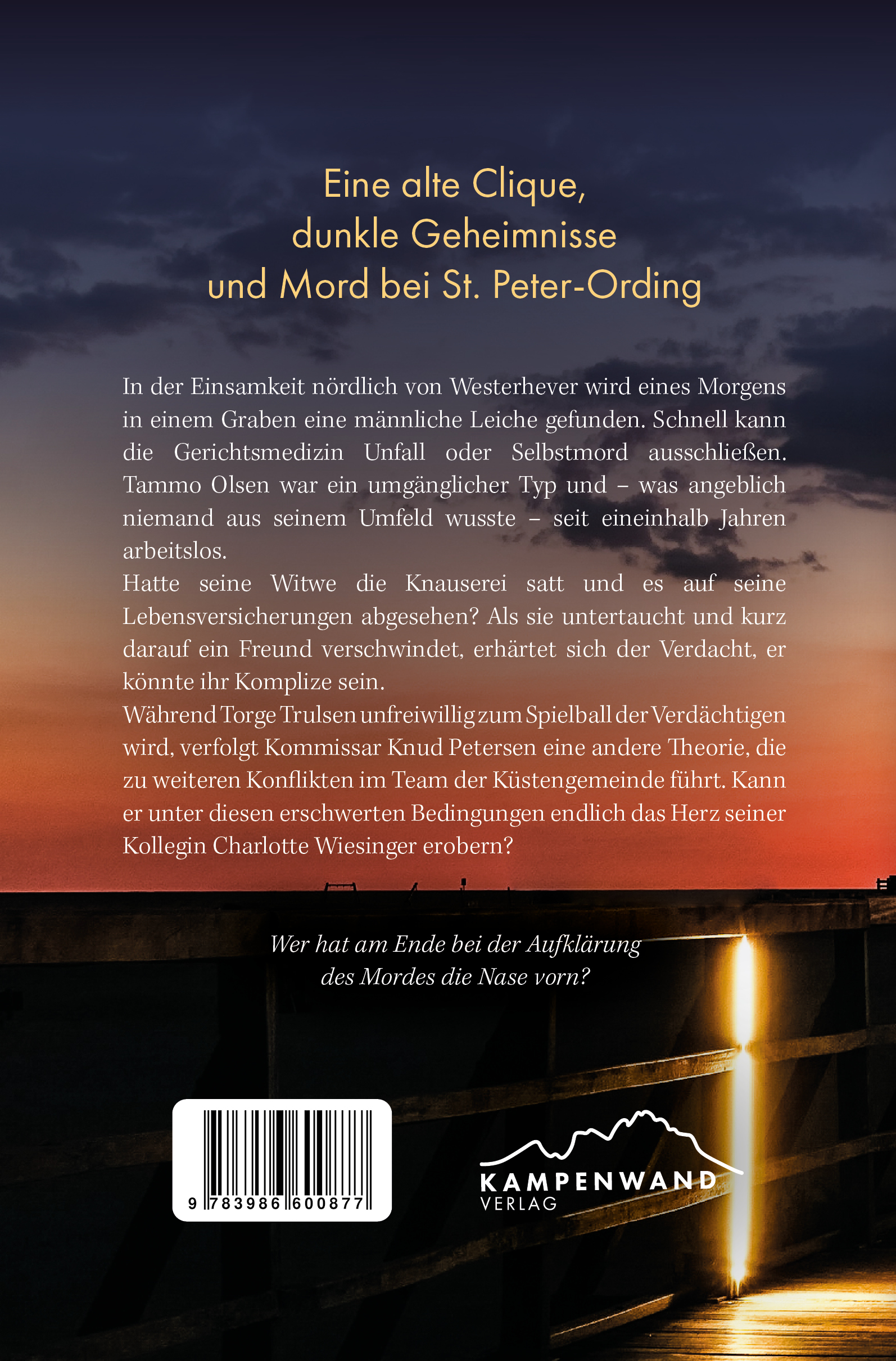 Eine alte Clique, dunkle Geheimnisse und Mord bei St. Peter-OrdingIn der Einsamkeit nördlich von Westerhever wird eines Morgens in einem Graben eine männliche Leiche gefunden. Schnell kann die Gerichtsmedizin Unfall oder Selbstmord ausschließen. Tammo Olsen war ein umgänglicher Typ und - was angeblich niemand aus seinem Umfeld wusste - seit eineinhalb Jahren arbeitslos. Hatte seine Witwe die Knauserei satt und es auf seine Lebensversicherungen abgesehen? Als sie untertaucht und kurz darauf ein Freund verschwindet, erhärtet sich der Verdacht, er könnte ihr Komplize sein.Während Torge Trulsen unfreiwillig zum Spielball der Verdächtigen wird, verfolgt Kommissar Knud Petersen eine andere Theorie, die zu weiteren Konflikten im Team der Küstengemeinde führt. Kann er unter diesen erschwerten Bedingungen endlich das Herz seiner Kollegin Charlotte Wiesinger erobern? Wer hat am Ende bei der Aufklärung des Mordes die Nase vorn?