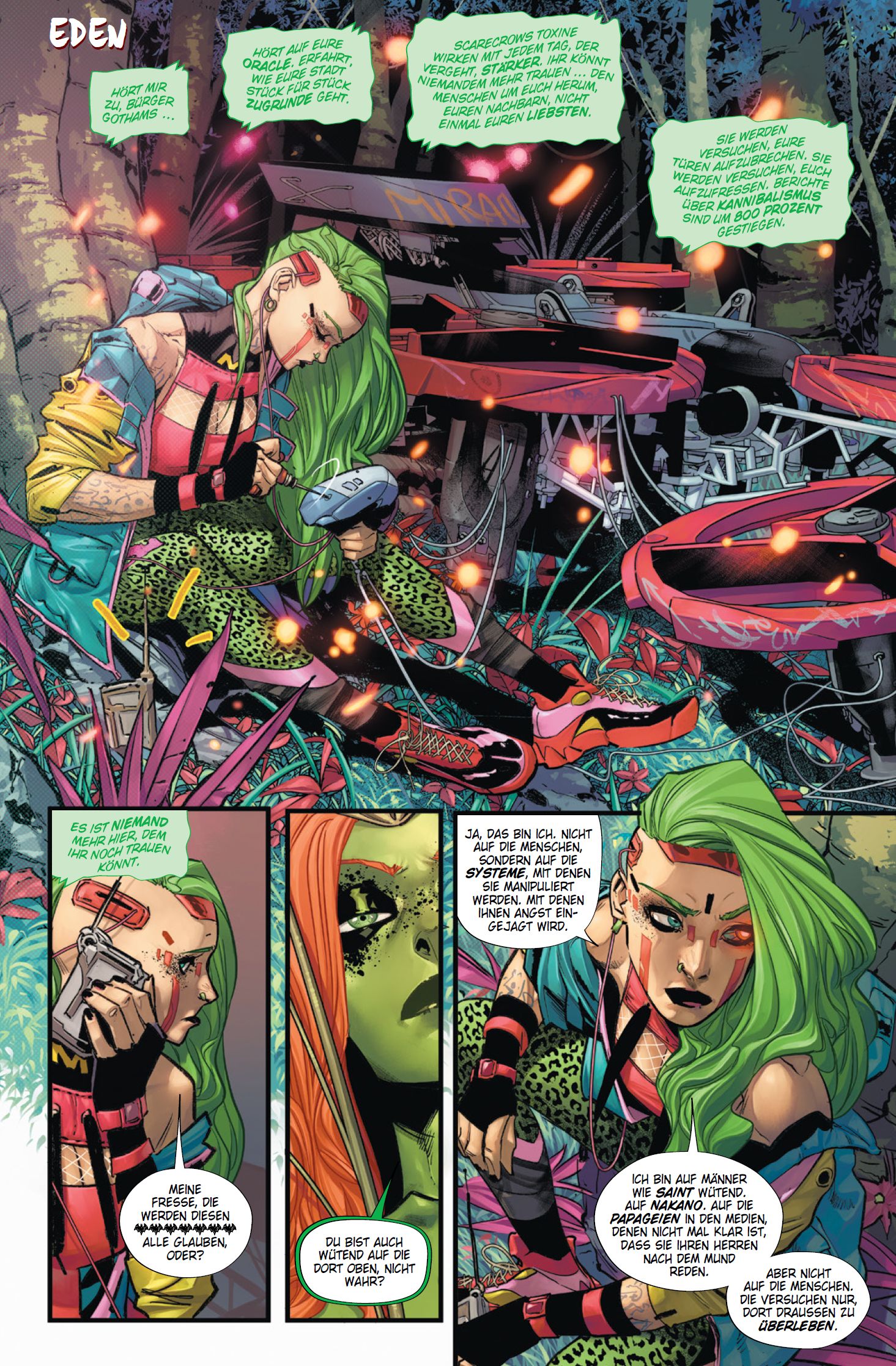 FURCHT UND FINSTERNIS IM REICH DER FLEDERMAUS von Christian Endres Die große BATMAN-Saga von Bestsellerautor und Eisner Award-Gewinner James Tynion IV sah früh ihr erstes Event-Spektakel: Im verheerenden, traumatisierenden Joker War verlor Bruce Wayne einen Großteil seines Vermögens und damit seiner Ressourcen, die ihm als Batman bisher zur Verfügung standen. Dennoch konnte er zusammen mit Jokers Ex Harley Quinn, dem jungen neuen Rächer Clownhunter, Catwoman, Nightwing und anderen Gotham City am Ende vor dem wahnsinnigen Joker und dessen Clown-Armee retten. Doch für Batman ging es Schlag auf Schlag weiter: Erst wollte der knallharte Verbrecherjäger Ghost-Maker, der einst bei denselben Meistern auf der ganzen Welt trainierte wie der junge Bruce, der neue Beschützer von Gotham werden und den Platz des Dunklen Ritters einnehmen, dann sorgte das anarchistische Kollektiv des Klarsinns um Master Wyze und Miracle Molly für einigen Ärger, obwohl es Gotham im Grunde nur von seinen Traumata und manipulierenden Kräften befreien wollte. Gothams neuer Bürgermeister Christopher Nakano, ein Ex-Cop mit einem gewaltigen Hass auf Batman und alle selbst ernannten maskierten Rächer, ließ sich überdies auf den reichen, zwielichtigen Industriellen Simon Saint ein, der von seinem Assistenten Ricardo unterstützt wird. Saint überzeugte Nakano davon, Gotham von seiner Hightech-Privatarmee Magistrat schützen zu lassen, die auch maskierte Helden wie Batman ins Visier nehmen soll. (Wohin dies letztendlich führen könnte, wurde zuvor im dystopischen Event Future State über eine mögliche Zukunft des DC-Universums durchgespielt.) Als Anführer des Magistrats war eigentlich Sean Mahoney vorgesehen, der jedoch bei der Zerstörung des Arkham Asylum im INFINITE FRONTIER SPECIAL schwer verletzt und von Saint in den Supersoldaten Peacekeeper-01 verwandelt wurde. Insgeheim paktierte Saint aber auch mit dem Superschurken Scarecrow, dem Meister der Furcht – der Saint jedoch verriet und nicht nur Mahoney, sondern ganz Gotham mit einem Furcht-Cocktail infizierte. Denn Scarecrow, bei dem es sich um den ehemaligen Psychiater Jonathan Crane handelt, will Gotham eine Lektion in Sachen Angst erteilen! Vor Batman, Hacker-Genie Barbara Gordon alias Oracle, den Batgirls Cassandra Cain und Stephanie Brown, Harley Quinn, Poison Ivys Ex Gardener, Ghost-Maker und Co. liegen schwierige Zeiten, wenn Gotham in diesem Deluxe-Sammelband zum Fear State wird, einem Stadtstaat der Angst. Harley hat zudem daran zu knabbern, dass ihre Beziehung zu Pflanzenflüsterin Poison Ivy in die Brüche ging, von der inzwischen sogar mehrere, charakterlich grundverschiedene Versionen gleichzeitig existieren – die sanfte Ivy und die in Gothams Untergrund herrschende Queen Ivy …