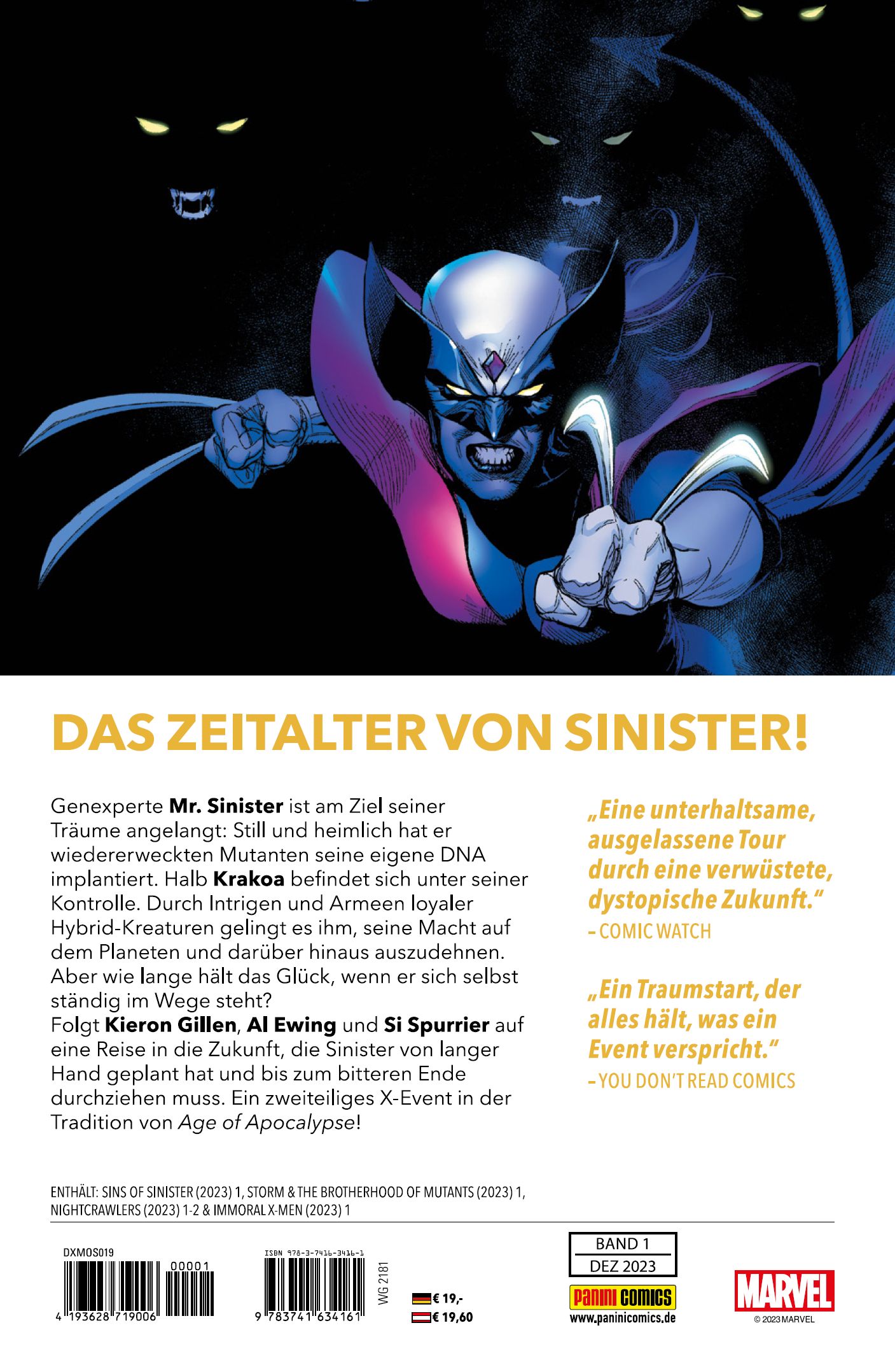 DAS ZEITALTER VON SINISTER!Gen-Experte Mr. Sinister ist am Ziel seiner Träume angelangt. Still und heimlich hat er wiedererweckten Mutanten seine eigene DNA implantiert. Halb Krakoa befindet sich unter seiner Kontrolle. Durch Intrigen und Armeen loyaler Hybrid-Kreaturen gelingt es ihm, seine Macht auf dem Planeten und darüber hinaus auszudehnen. Aber wie lange hält das Glück, wenn er sich selbst ständig im Wege steht? Folgt Kieron Gillen, Al Ewing und Si Spurrier auf eine Reise in die Zukunft, die Sinister von langer Hand geplant hat und bis zum bitteren Ende durchziehen muss. Ein zweiteiliges X-Event in der Tradition von Age of Apocalypse! ENTHÄLT: SINS OF SINISTER (2023) 1, STORM & THE BROTHERHOOD OF MUTANTS (2023) 1, NIGHTCRAWLERS (2023) 1-2 & IMMORAL X-MEN (2023) 1