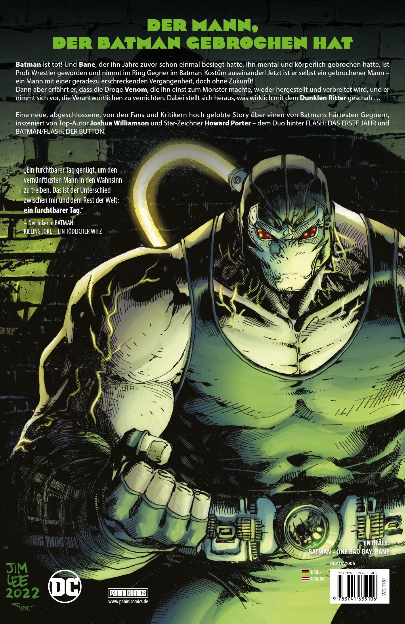 DER MANN, DER BATMAN GEBROCHEN HAT Batman ist tot! Und Bane, der ihn Jahre zuvor schon einmal besiegt hatte, ihn mental und körperlich gebrochen hatte, ist Profi-Westler geworden und nimmt im Ring Gegner im Batman-Kostüm auseinander! Jetzt ist er selbst ein gebrochener Mann - ein Mann mit einer geradezu erschreckenden Vergangenheit, doch ohne Zukunft! Dann aber erfährt er, dass die Droge Venom, die ihn einst zum Monster machte, wieder hergestellt und verbreitet wird, und er nimmt sich vor, die Verantwortlichen zu vernichten. Dabei stellt sich heraus, was wirklich mit dem Dunklen Ritter geschah ... Eine neue, abgeschlossene, von den Fans und Kritikern hoch gelobte Story über einen von Batmans härtesten Gegnern, inszeniert von Top-Autor Joshua Williamson und Star-Zeichner Howard Porter - dem Duo hinter FLASH: DAS ERSTE JAHR und BATMAN/FLASH: DER BUTTON. ENTHÄLT: BATMAN - ONE BAD DAY: BANE