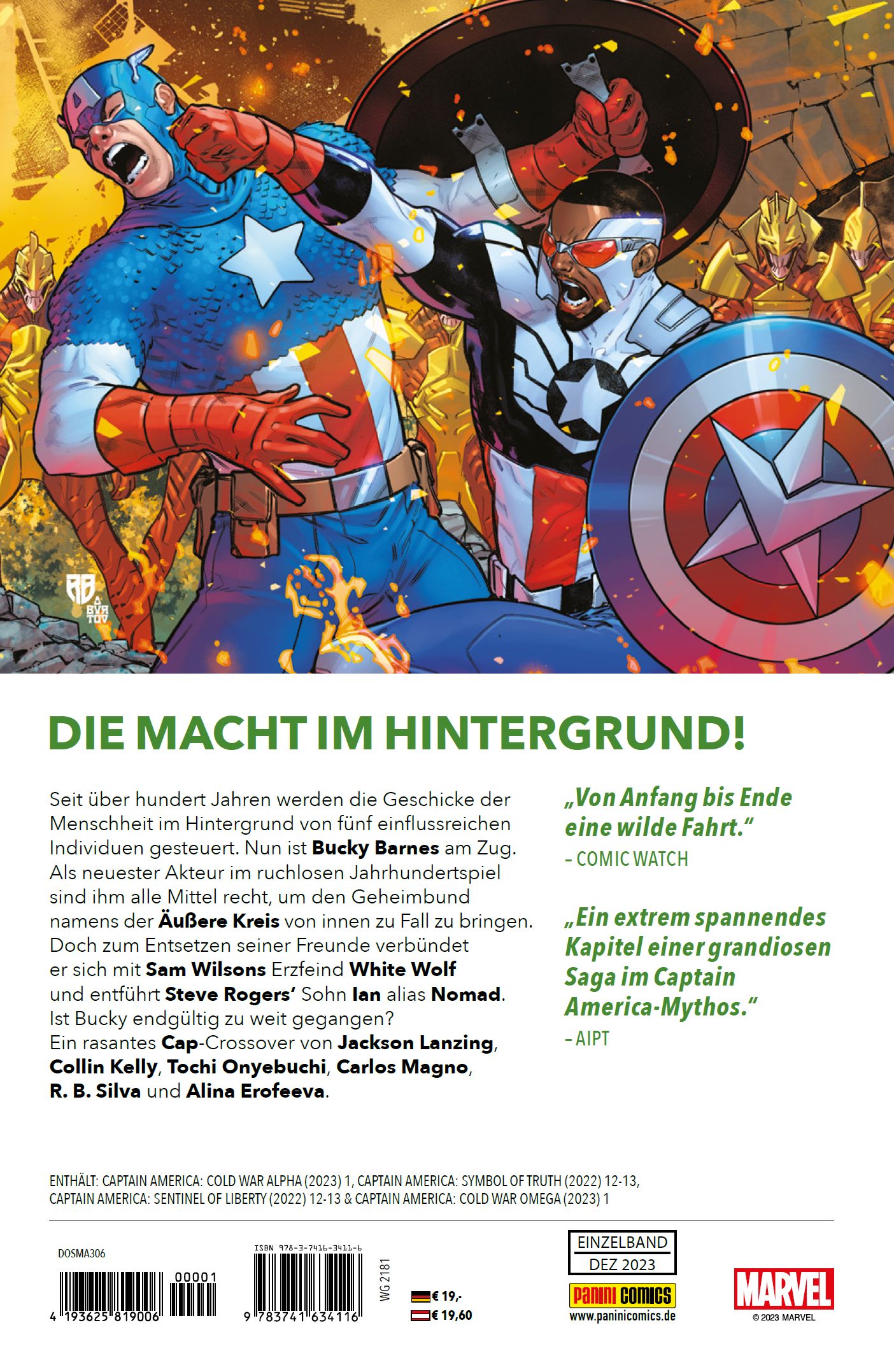 DIE MACHT IM HINTERGRUND! Seit über hundert Jahren werden die Geschicke der Menschheit im Hintergrund von fünf einfl ussreichen Individuen gesteuert. Nun ist Bucky Barnes am Zug. Als neuester Akteur im ruchlosen Jahrhundertspiel sind ihm alle Mittel recht, um den Geheimbund namens der Äußere Kreis von innen zu Fall zu bringen. Doch zum Entsetzen seiner Freunde, verbündet er sich mit Sam Wilsons Erzfeind White Wolf und entführt Steve Rogers Sohn Ian alias Nomad. Ist Bucky endgültig zu weit gegangen? Ein rasantes Cap-Crossover von Jackson Lanzing, Collin Kelly, Tochi Onyebuchi, Carlos Magno, R. B. Silva und Alina Erofeeva. ENTHÄLT: CAPTAIN AMERICA: COLD WAR ALPHA (2023) 1, CAPTAIN AMERICA: SYMBOL OF TRUTH (2022) 12-13, CAPTAIN AMERICA: SENTINEL OF LIBERTY (2022) 12-13 & CAPTAIN AMERICA: COLD WAR OMEGA (2023) 1