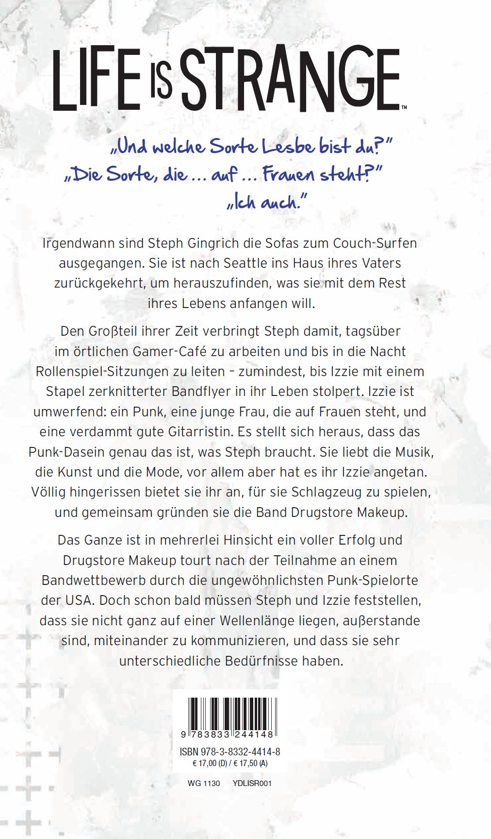 | Schlagworte | Beziehung • Buch • Bücher • Drugstore Makeup • gleichgeschlechtliche Liebe • H23 • izzie • Lesbe • Lesben • Lesbische Liebe • Life is Strange • Life is strange Roman • Life is Strange: True Colors • Panini • PB • Prequel • Prequel Life is strange • Roman • Square Enix • Steph Gingrich |