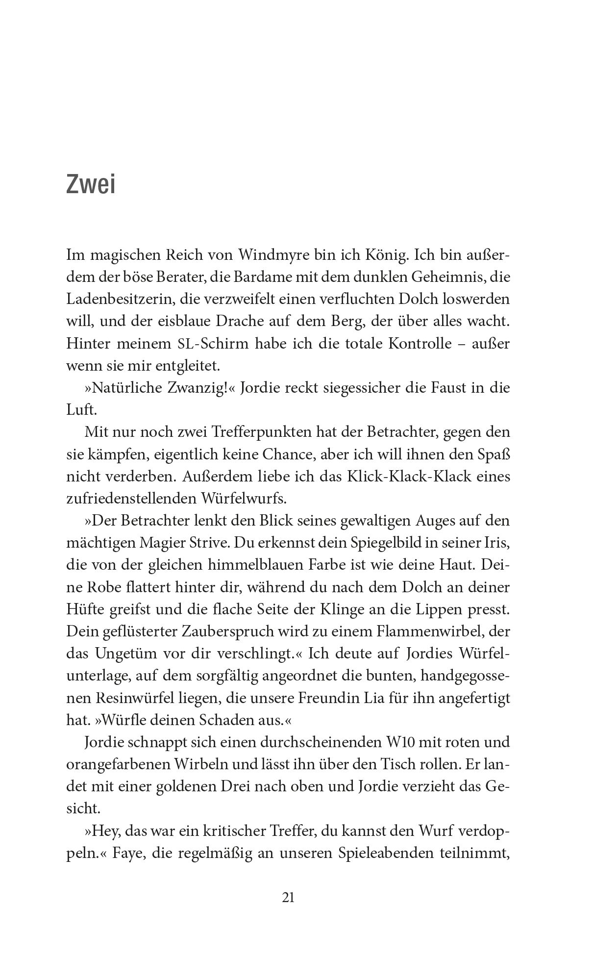 „Sie verstehen es einfach nicht“, sagt Izzie mit einem Seufzer. „Sie wollen, dass unsere eigene Musik so ist wie … Ich weiß auch nicht! Nur Chill-Vibes?“ „Was soll das denn heißen?“ Ich verziehe das Gesicht. „Ihr seid eine Rockband. Das ist nicht gerade leichte Kost.“ „Ich glaube, sie wollen, dass unsere Songs … ein positives Gefühl vermitteln.“ „Also keine Lieder über eine frische Trennung oder darüber, wie beschissen es ist, als heißer Rockstar immer noch Single zu sein.“ „Versuchst du rauszukriegen, ob ich Single bin?“ Izzie knufft mich mit dem Ellbogen in die Rippen, aber auf ihren Lippen liegt ein Lächeln, das vorher definitiv nicht da war. Dann lehnt sie sich zurück gegen ihren Van und schließt die Augen. „Die Sache ist die, sie verstehen einfach nicht, dass mein Leben nicht nur aus Regenbögen und Eiskaffee besteht, verstehst du? Ich habe viel Scheiße erlebt. Und ich will nicht nur über Liebe und Partys singen. Ich will auch über Dinge singen, die mich wütend machen und auch über Sachen, die mich traurig machen.“ „Und das gefällt ihnen wohl nicht.“ Sie schüttelt den Kopf. „Wir hätten heute Abend mein neues Lied vorstellen sollen. Wir haben den Song wochenlang geübt und ich hatte angenommen, er wäre echt gut. Aber ich schätze, sie haben einfach ohne mich entschieden, dass Vinyl Resting Place Izzie Margolis nicht braucht.“ „Das ist echt scheiße.“ Mein Blick fällt auf ihre Hand, die mit der Handfläche nach oben auf ihrer dunklen Jeans liegt. Es wäre so einfach, meine in ihre zu legen. Ihre Haut sieht so weich aus und ich möchte mit der Fingerspitze ihre Lebenslinie nachzeichnen. Und vielleicht würde sie sich dann besser fühlen. Oder vielleicht würde ich mich dann besser fühlen. Stattdessen schaue ich zu ihrem Gesicht hoch, zu der verschmierten Wimperntusche auf ihren Wangenknochen und dem Lippenstift, der stellenweise schon verblasst ist. Dann lehne ich mich vor, um zu fragen: „Kann ich es hören?“