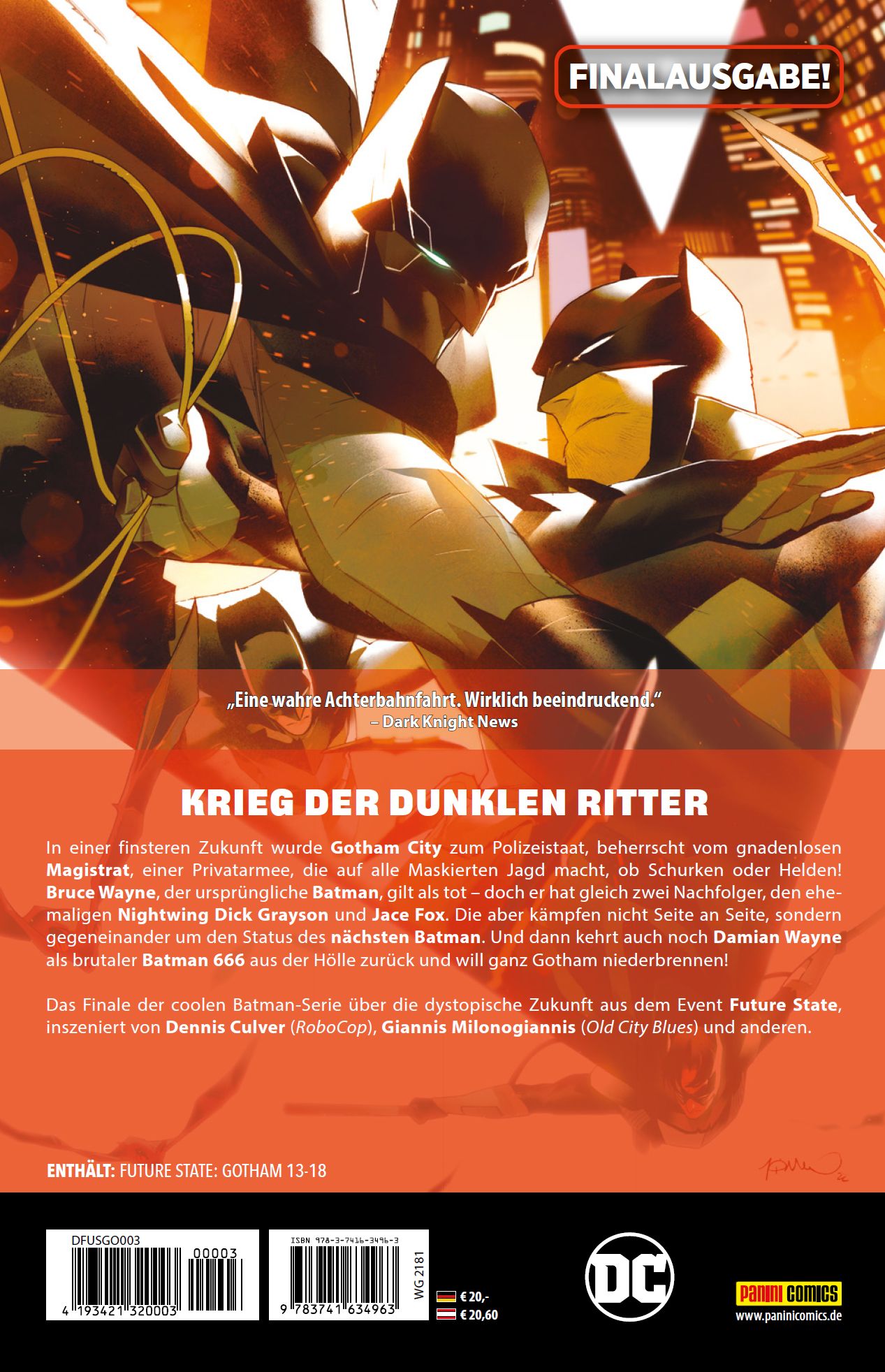 KRIEG DER DUNKLEN RITTER In einer finsteren Zukunft wurde Gotham City zum Polizeistaat, beherrscht vom gnadenlosen Magistrat, einer Privatarmee, die auf alle Maskierten Jagd macht, ob Schurken oder Helden! Bruce Wayne, der ursprüngliche Batman, gilt als tot - doch er hat gleich zwei Nachfolger, den ehemaligen Nightwing Dick Grayson und Jace Fox. Die aber kämpfen nicht Seite an Seite, sondern gegeneinander um den Status des nächsten Batman. Und dann kehrt auch noch Damian Wayne als brutaler Batman 666 aus der Hölle zurück und will ganz Gotham niederbrennen! Das Finale der coolen Batman-Serie über die dystopische Zukunft aus dem Event Future State, inszeniert von Dennis Culver (RoboCop), Giannis Milonogiannis (Old City Blues) und anderen. ENTHÄLT: FUTURE STATE: GOTHAM 13-18FINALAUSGABE!