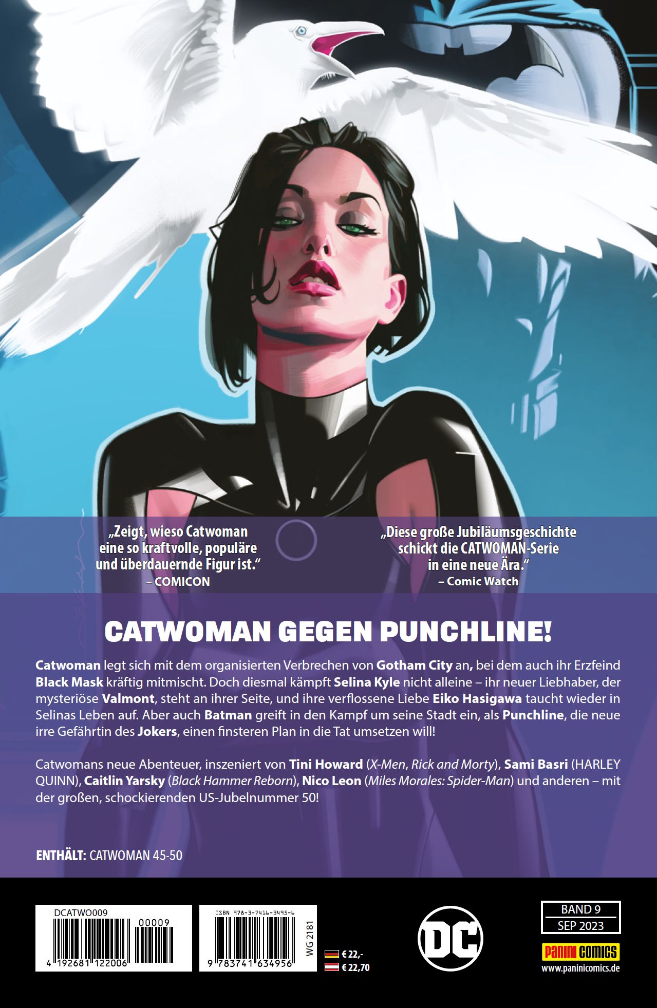 CATWOMAN GEGEN PUNCHLINE! Catwoman ist im Kampf gegen das organisierte Verbrechen von Gotham City, bei dem auch ihr Erzfeind Black Mask Kräftig mitmischt. Doch diesmal kämpft Selina Kyle nicht alleine - ihr neuer Liebhaber, der mysteriöse Valmont, steht an ihrer Seite, und ihre verflossene Liebe Eiko Hasigawa taucht wieder in Selinas Leben auf. Aber auch Batman greift in den Kampf um seine Stadt ein, als Punchline, die neue irre Gefährtin des Jokers, einen finsteren Plan in die Tat umsetzen will! Catwomans neue Abenteuer, inszeniert von Tini Howard (X-Men, Rick and Morty), Sami Basri (HARLEY QUINN), Caitlin Yarsky (Black Hammer Reborn), Nico Leon (Miles Morales: Spider-Man) und anderen - mit der großen, schockierenden US-Jubelnummer 50! ENTHÄLT: CATWOMAN 45-50