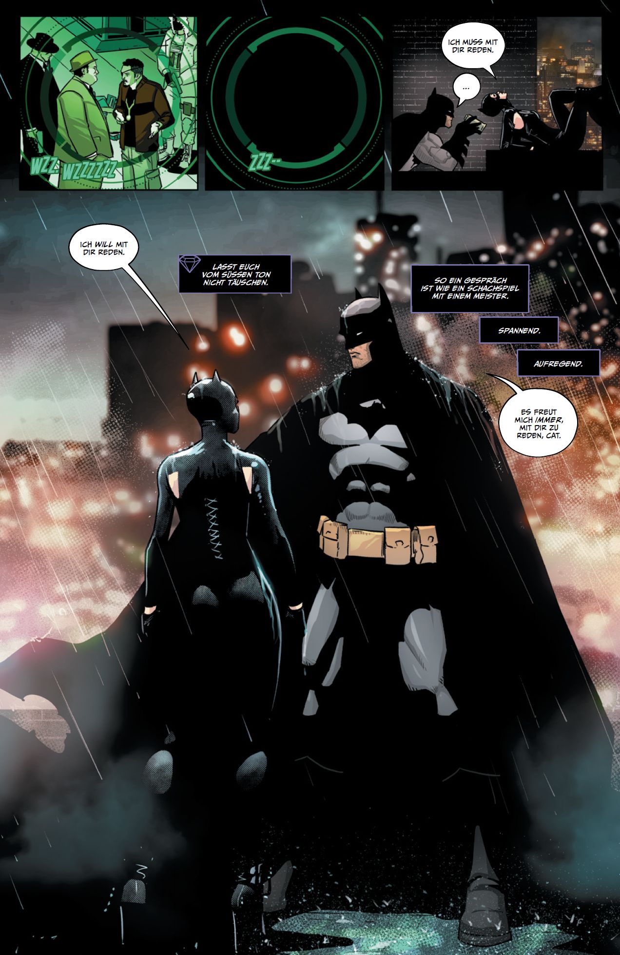 KRATZSPUREN von Christian Endres Die einstige Prostituier te Selina Kyle ist Catwoman. Viele Jahre lang war die Meisterdiebin als Superschurkin unterwegs, die im Verlauf ihrer kriminellen Karriere verschiedene Kostüme und Frisuren trug. Allerdings wurde die peitschenschwingende Katzenflüsterin auch die große Liebe von Batman – und verwandelte sich immer mehr in eine Antiheldin. Als solche will Catwoman heute vor allem jene vor Verbrechen, Ausbeutung und Korruption beschützen, die das nicht selbst tun können. Vor nicht allzu langer Zeit wollten Selina und Bruce zudem heiraten, jedoch wurde am Ende nichts aus diesen Plänen. Derzeit machen die beiden, obwohl ihre Gefühle füreinander unverändert sind, sogar eine Beziehungspause, da sich Batman darauf konzentrieren will, seine Welt als Held im Zeichen der Fledermaus in Ordnung zu bringen (zu der auch Dick Grayson alias Nightwing, Tim Drake alias Robin sowie die von Oracle alias Barbara Gordon angeleiteten Batgirls Stephanie Brown und Cassandra Cain gehören). Im vorangegangenen Band dieser CATWOMAN-Serie begann die Saga von Autorin Tini Howard, Zeichner Nico Leon und anderen. Zum Auftakt legte sich Selina einmal mehr mit dem organisierten Verbrechen in Gotham City an. Dessen Große Vier sind derzeit Finbar Sullivan, Dragos Ibanescu, Federico Tomasso und Selinas Ex Eiko Hasigawa. Aber auch Catwomans Erzfeind Black Mask ist im Spiel und zieht mal wieder die Fäden. Selina zog ins von Mafia-Liebschaften bewohnte Apartment namens Das Trixie, tat sich mit der knallharten Onyx Adams und dem die Mafia hassenden Tomasso-Sprössling Dario zusammen, traf ihren neuen, schwer zu durchschauenden Partner Valmont und durchkreuzte einmal mehr Black Masks Pläne. Außerdem erlebte sie ein Abenteuer mit Harley Quinn, der ehemaligen Gehilfin des Jokers. Deren Platz hat neuerdings die eiskalte, manipulative wie mörderische Punchline eingenommen, die früher einmal die Studentin Alexis Kaye war, die den Joker verehrte und schließlich seine rechte Hand im Joker-Krieg wurde …