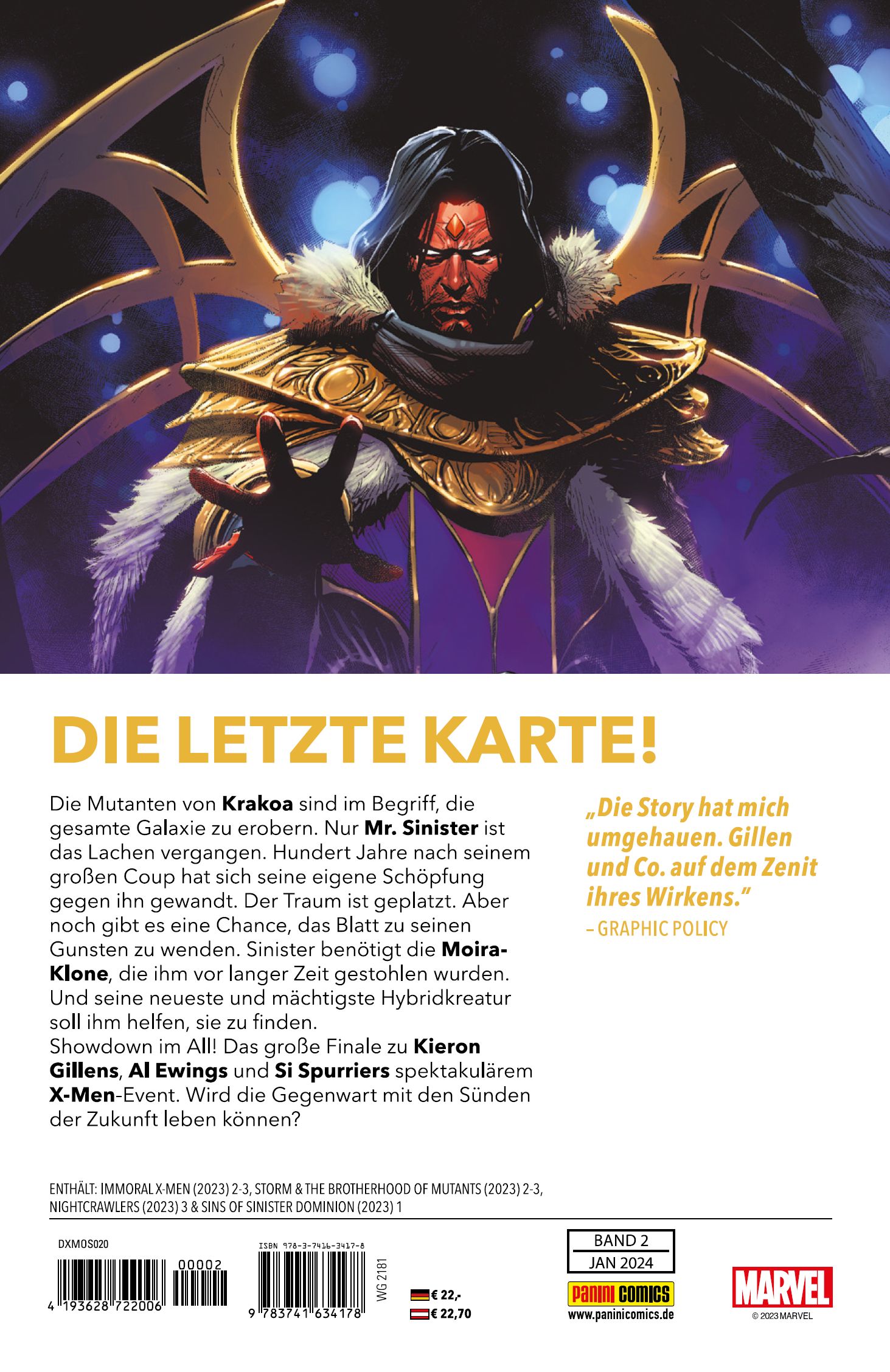 DIE LETZTE KARTE!Die Mutanten von Krakoa sind im Begriff, die gesamte Galaxie zu erobern. Nur Mr. Sinister ist das Lachen vergangen. Hundert Jahre nach seinem großen Coup hat sich seine eigene Schöpfung gegen ihn gewandt. Der Traum ist geplatzt. Aber noch gibt es eine Chance, das Blatt zu seinen Gunsten zu wenden. Sinister benötigt die Moira-Klone, die ihm vor langer Zeit gestohlen wurden. Und seine neueste und mächtigste Hybridkreatur soll ihm helfen, sie zu finden. Showdown im All! Das große Finale zu Kieron Gillens, Al Ewings und Si Spurriers spektakulärem X-Men-Event. Wird die Gegenwart mit den Sünden der Zukunft leben können?IMMORAL X-MEN (2023) 2-3; STORM & THE BROTHERHOOD OF MUTANTS (2023) 2-3; NIGHTCRAWLWE (2023) 3 & SINS OF SINISTER DOMINION (2023) 1