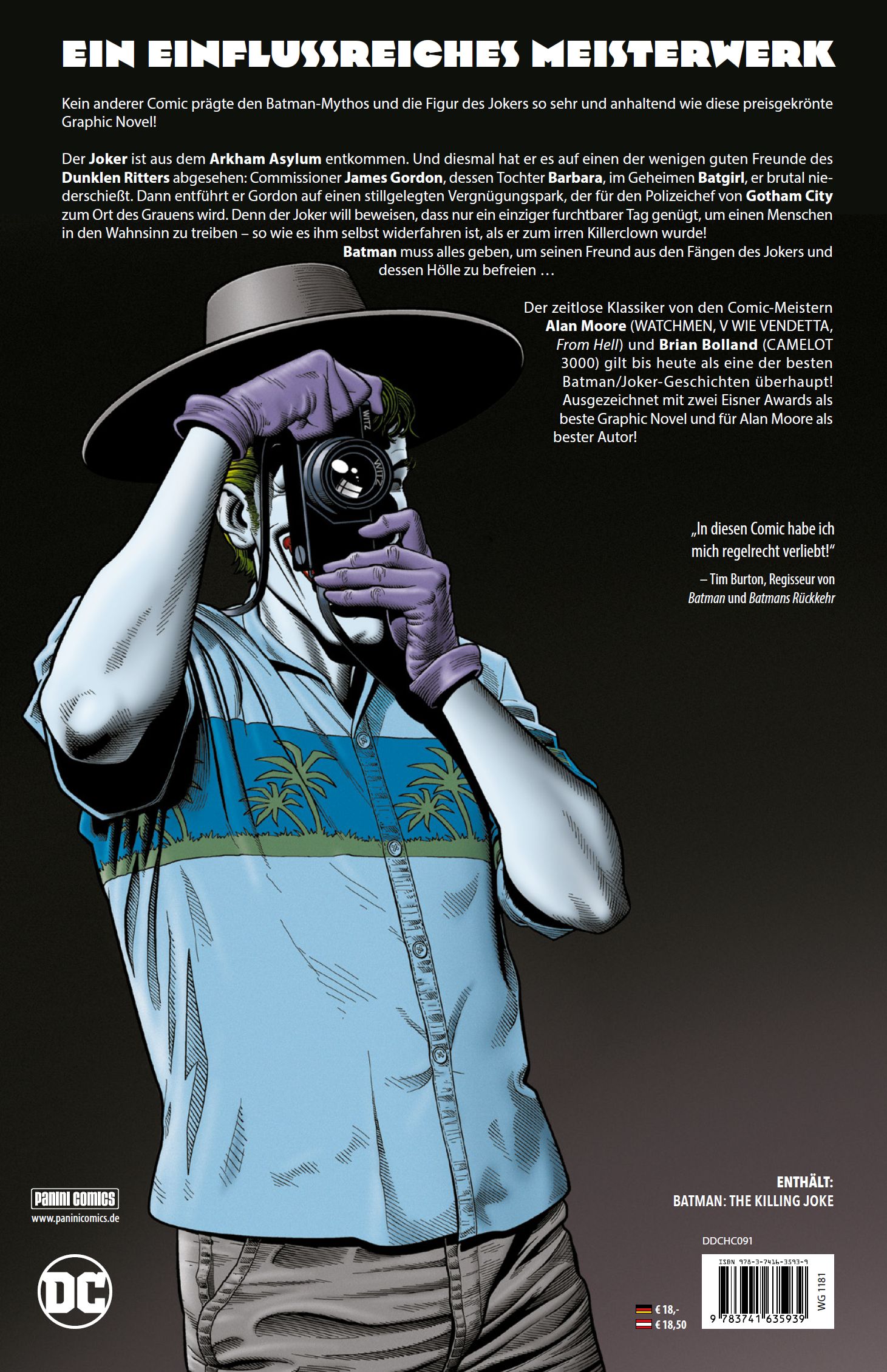 EIN EINFLUSSREICHES MEISTERWERK Kein anderer Comic prägte den Batman-Mythos und die Figur des Jokers so sehr und anhaltend wie diese preisgekrönte Graphic Novel! Der Joker ist aus dem Arkham Asylum entkommen. Und diesmal hat er es auf einen der wenigen guten Freunde des Dunklen Ritters abgesehen: Commissioner James Gordon, dessen Tochter Barbara, im Geheimen Batgirl, er brutal niederschießt. Dann entführt er Gordon auf einen stillgelegten Vergnügungspark, der für den Polizeichef von Gotham City zum Ort des Grauens wird. Denn der Joker will beweisen, dass nur ein einziger furchtbarer Tag genügt, um einen Menschen in den Wahnsinn zu treiben - so wie es ihm selbst wiederfahren ist, als er zum irren Killerclown wurde! Batman muss alles geben, um seinen Freund aus den Fängen des Jokers und dessen Hölle zu befreien ... Der zeitlose Klassiker von den Comic-Meistern Alan Moore (WATCHMEN, V WIE VENDETTA, From Hell) und Brian Bolland (CAMELOT 3000) gilt bis heute als eine der besten Batman/Joker-Geschichten überhaupt! Ausgezeichnet mit zwei Eisner Awards als beste Graphic Novel und für Alan Moore als bester Autor! ENTHÄLT: BATMAN: THE KILLING JOKE
