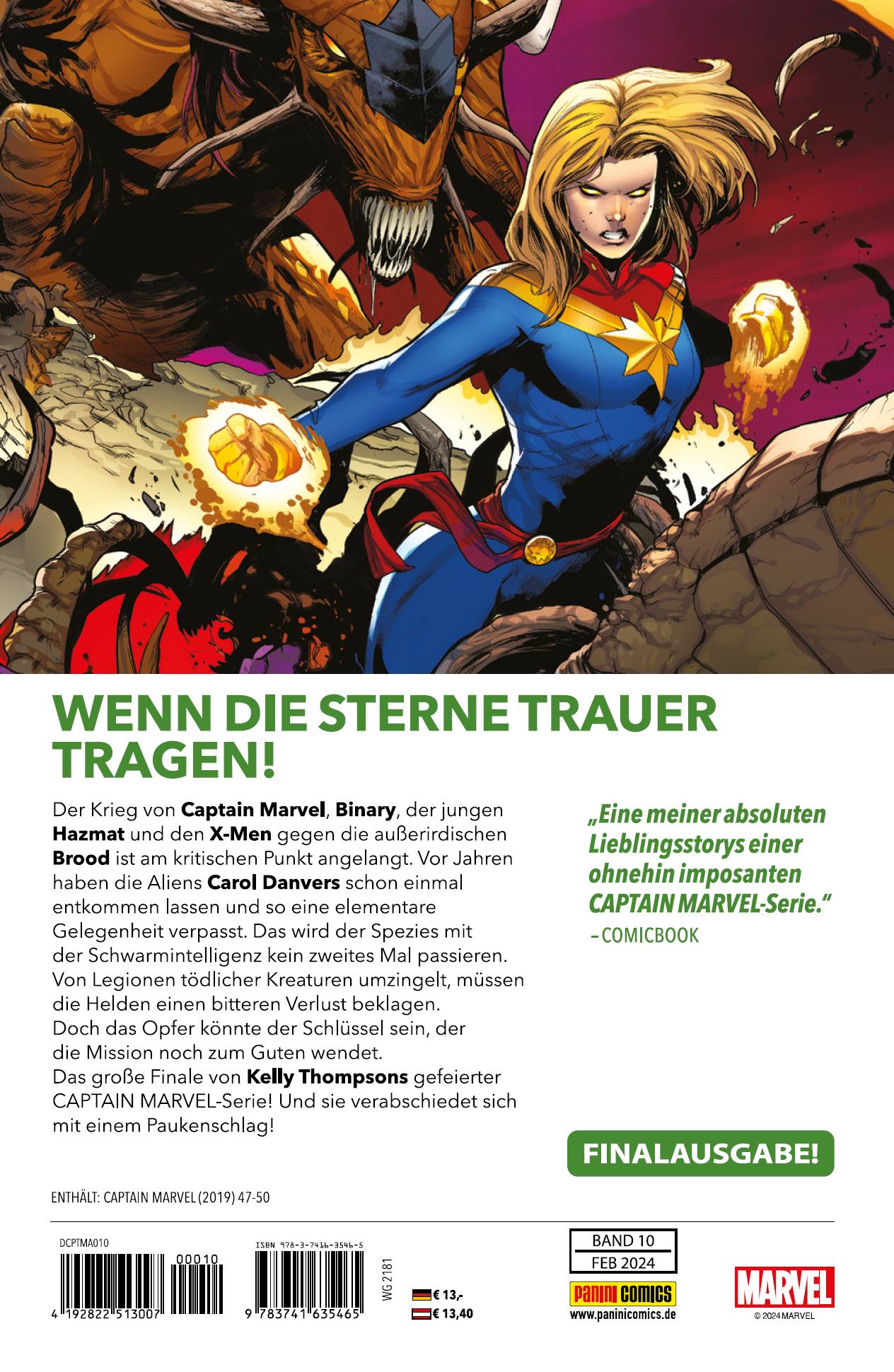 WENN DIE STERNE TRAUER TRAGEN!Der Krieg von Captain Marvel, Binary, der jungen Hazmat und den X-Men gegen die außerirdischen Brood ist am kritischen Punkt angelangt. Vor Jahren haben die Aliens Carol Danvers schon einmal entkommen lassen und so eine elementare Gelegenheit verpasst. Das wird der Spezies mit der Schwarmintelligenz kein zweites Mal passieren. Von Legionen tödlicher Kreaturen umzingelt, müssen die Helden einen bitteren Verlust beklagen. Doch das Opfer könnte der Schlüssel sein, der die Mission noch zum Guten wendet.Das große Finale von Kelly Thompsons gefeierter CAPTAIN MARVEL-Serie! Und sie verabschiedet sich mit einem Paukenschlag!ENTHÄLT: CAPTAIN MARVEL (2019) #47-#50FINALAUSGABE!