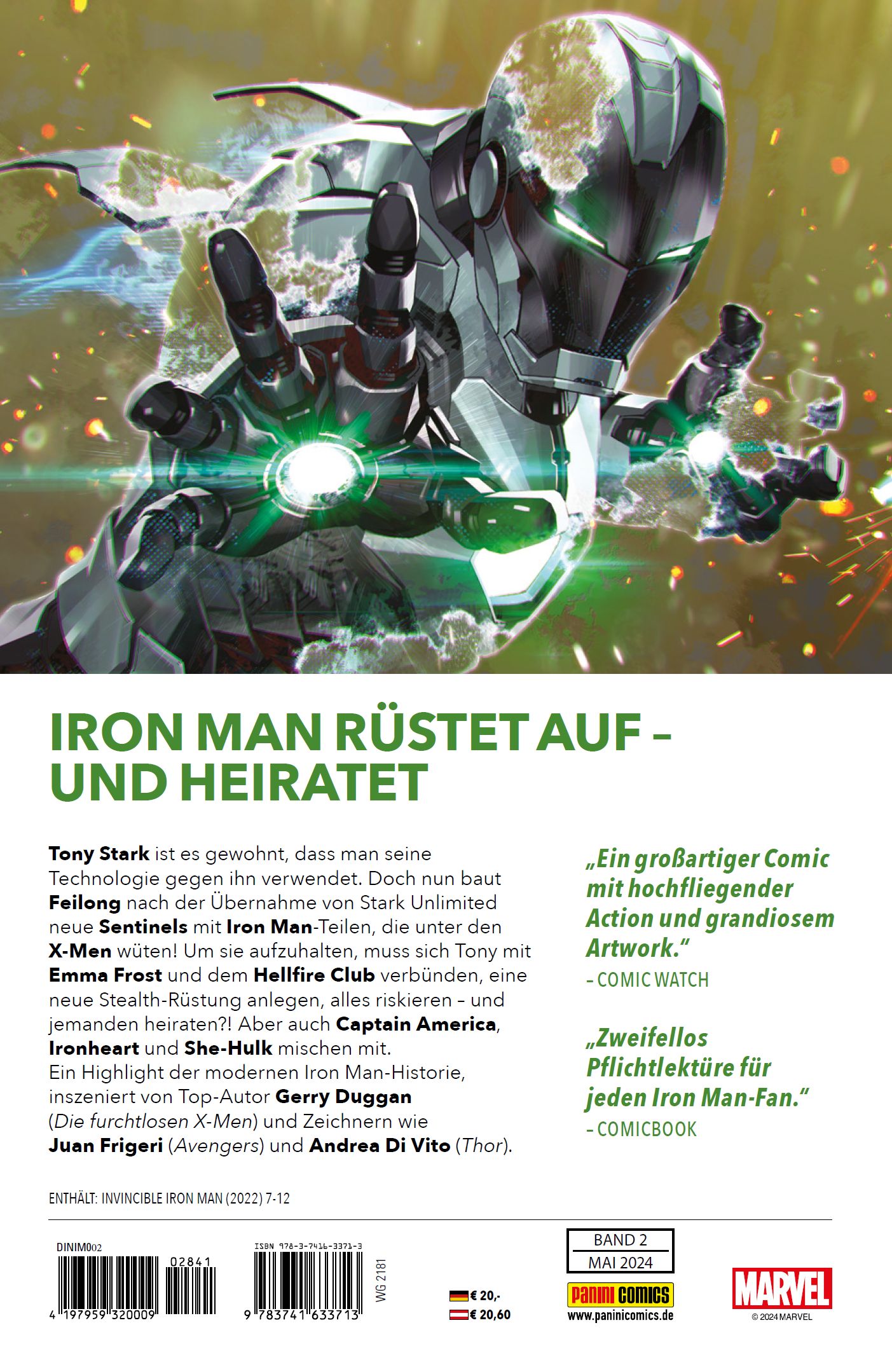 IRON MAN RÜSTET AUF - UND HEIRATETTony Stark ist es gewohnt, dass man seine Technologie gegen ihn verwendet. Doch nun baut Feilong nach der Übernahme von Stark Unlimited neue Sentinels mit Iron Man-Teilen, die unter den X-Men wüten! Um sie aufzuhalten, muss sich Tony mit Emma Frost und dem Hellfire Club verbünden, eine neue Stealth-Rüstung anlegen, alles riskieren - und jemanden heiraten?! Aber auch Captain America, Ironheart und She-Hulk mischen mit. Ein Highlight der modernen Iron Man-Historie, inszeniert von Top-Autor Gerry Duggan (Die furchtlosen X-Men) sowie von Zeichnern wie Juan Frigeri (Avengers) und Andrea Di Vito (Thor).ENTHÄLT: INVINCIBLE IRON MAN (2022) 7-12