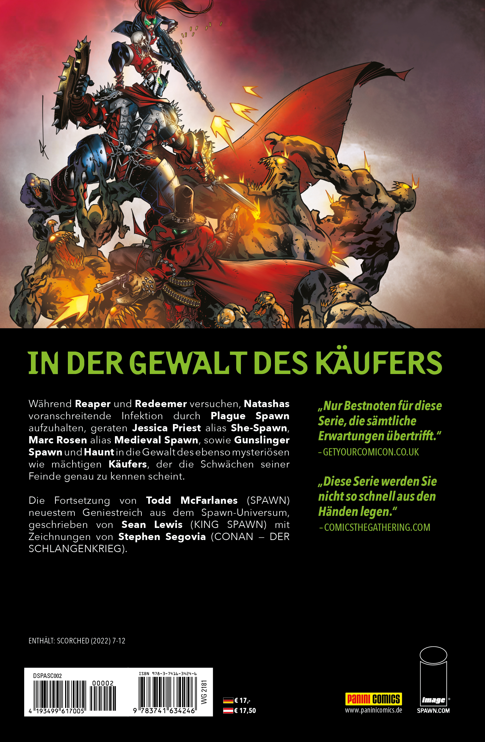 IN DER GEWALT DES KÄUFERSWährend Reaper und Redeemer versuchen, Natashas voranschreitende Infektion durch Plague Spawn aufzuhalten, geraten Jessica Priest alias She-Spawn, Marc Rosen alias Medieval Spawn, sowie Gunslinger Spawn und Haunt in die Gewalt des ebenso mysteriösen wie mächtigen Käufers, der die Schwächen seiner Feinde genau zu kennen scheint.Die Fortsetzung von Todd McFarlanes (SPAWN) neuestem Geniestreich aus dem Spawn-Universum, geschrieben von Sean Lewis (KING SPAWN) mit Zeichnungen von Stephen Segovia (CONAN - DER SCHLANGENKRIEGER).ENTHÄLT: SCORCHED (2022) 7-12