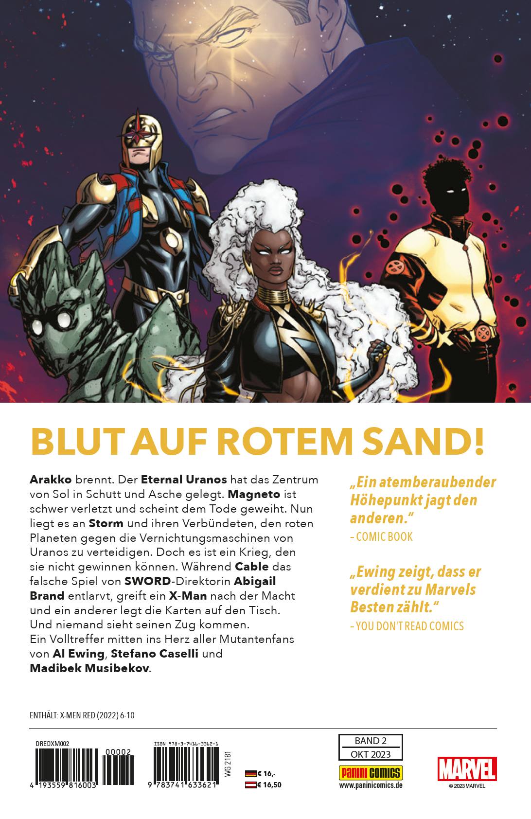 BLUT AUF ROTEM SAND! Arakko brennt. Der Eternal Uranos hat das Zentrum von Sol in Schutt und Asche gelegt. Magneto ist schwer verletzt und scheint dem Tode geweiht. Nun liegt es an Storm und ihren Verbündeten, den roten Planeten gegen die Vernichtungsmaschinen von Uranos zu verteidigen. Doch es ist ein Krieg, den sie nicht gewinnen können. Während Cable das falsche Spiel von SWORD-Direktorin Abigail Brand entlarvt, greift ein X-Man nach der Macht und ein anderer legt die Karten auf den Tisch. Und niemand sieht seinen Zug kommen. Ein Volltreffer mitten ins Herz aller Mutantenfans von Al Ewing, Stefano Caselli und Madibek Musibekov. ENTHÄLT: X-MEN RED (2022) 6-10