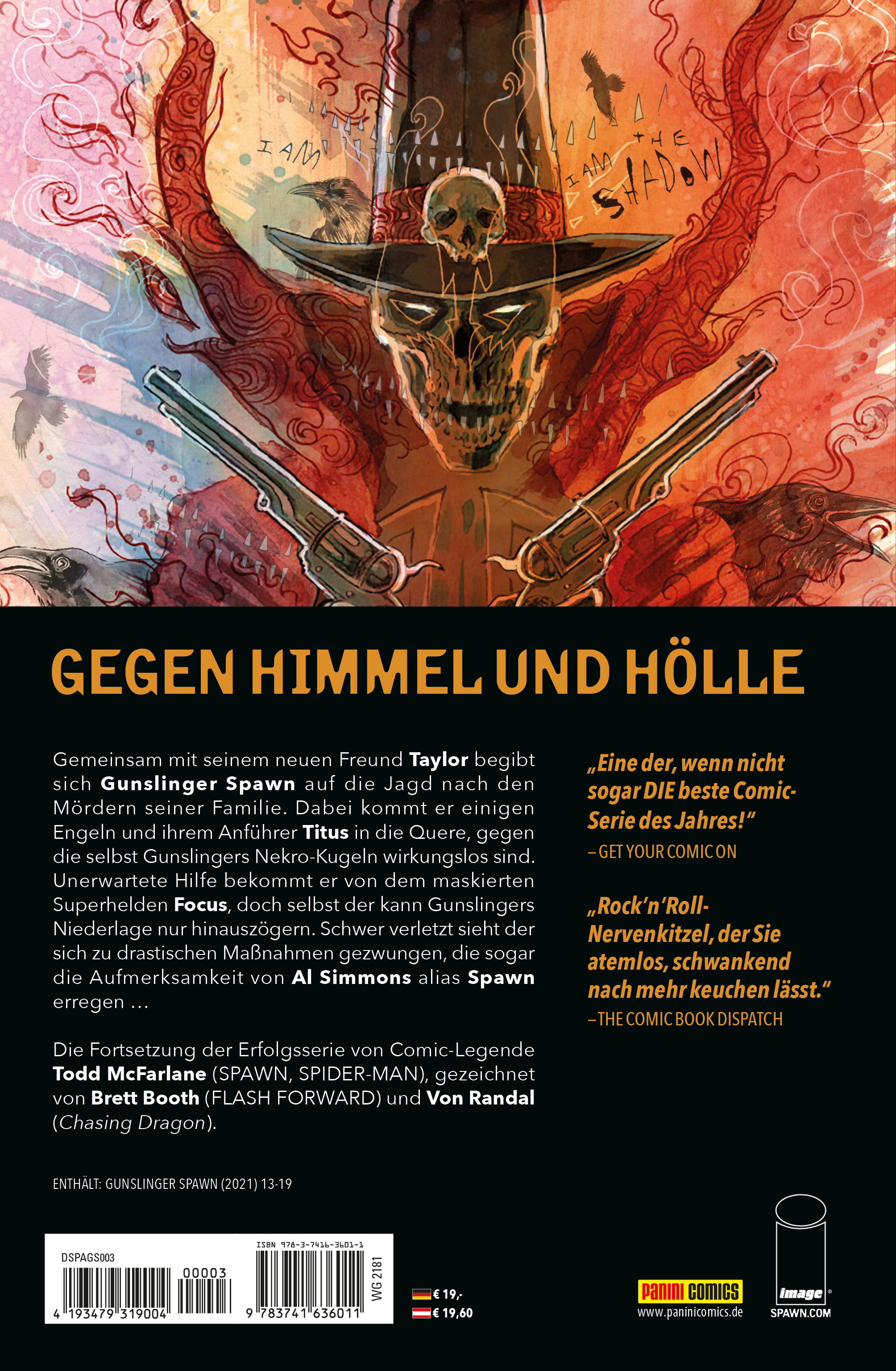 GEGEN HIMMEL UND HÖLLEGemeinsam mit seinem neuen Freund Taylor begibt sich Gunslinger Spawn auf die Jagd nach den Mördern seiner Familie. Dabei kommt er einigen Engeln und ihrem Anführer Titus in die Quere, gegen die selbst Gunslingers Nekro-Kugeln wirkungslos sind. Unerwartete Hilfe bekommt er von dem maskierten Superhelden Focus, doch selbst der kann Gunslingers Niederlage nur hinauszögern. Schwer verletzt sieht der sich zu drastischen Maßnahmen gezwungen, die sogar die Aufmerksamkeit von Al Simmons alias Spawn erregen...Die Fortsetzung der Erfolgsserie von Comic-Legende Todd McFarlane (SPAWN, SPIDER-MAN), gezeichnet von Brett Booth (FLASH FORWARD) und Von Randal (Chasing Dragon).ENTHÄLT: GUNSLINGER SPAWN (2021) 13-19
